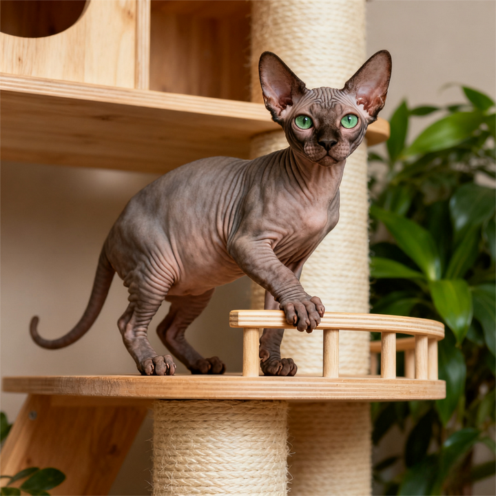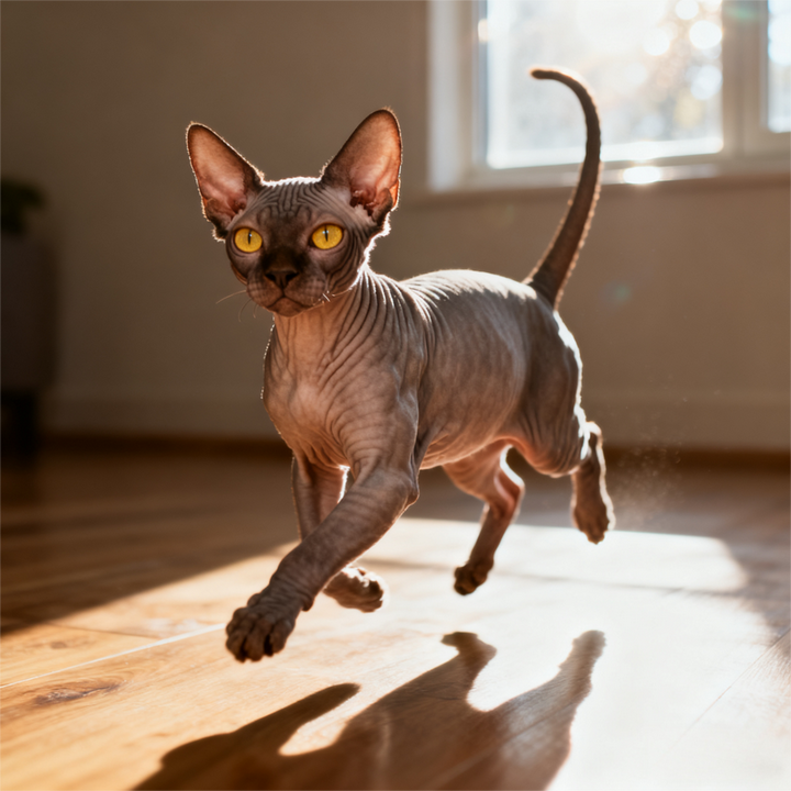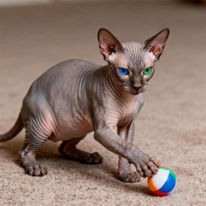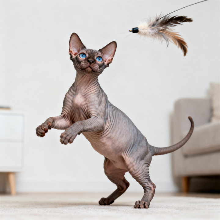 捕猎本能温和可控:对飞虫、激光笔等移动目标有一定兴趣,但不会像阿比西尼亚猫那样 “穷追不舍”,更多是 “玩票式” 追逐,捕捉到玩具后会叼给主人邀功,互动性极强。因其无毛特质,饲主需避免让其接触尖锐玩具,防止划伤皮肤。