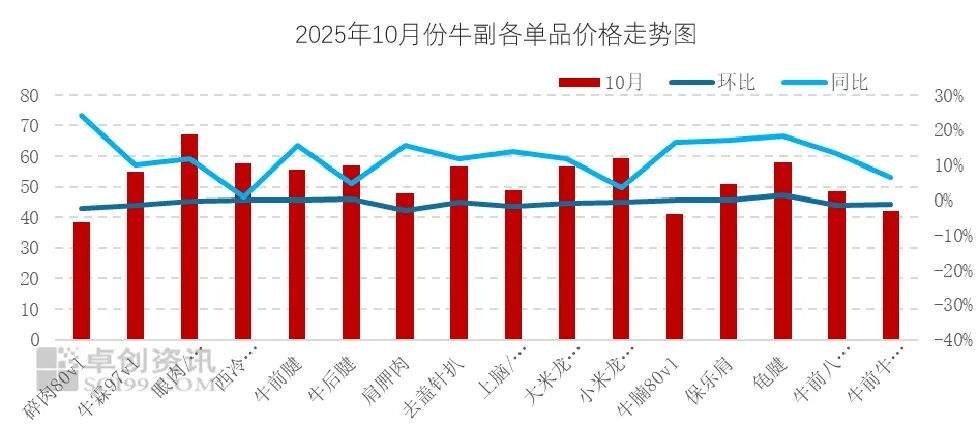 10月,巴西牛肉各部位价格环比下降居多,最大产品跌幅在3.03%,但仍较去年同期水平上涨显著,最大产品涨幅在24.19%。10月国内冻品库存延续充盈态势,巴西、阿根廷等国家进口量保持增加趋势,而国内进口商走货速度一般,下游贸易商接货能力有限,且终端消费不达预期,导致月内进口牛肉价格以下滑为主。