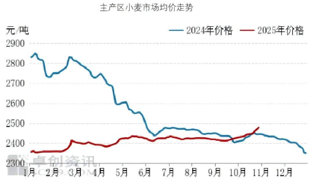 小麦价格持续抬升,蔬菜价格走势分化2025年10月,小麦市场价格重心维持上移态势。上半月主产区降水天气偏多叠加秋收农忙,市场散粮流通量维持偏低状态,支撑价格上涨。下半月天气影响虽减弱,但秋收秋播关键时期,基层出货积极性不足,且粮商购销重心转向玉米等作物,叠加卖跌不卖涨情绪影响,面粉企业散粮到货量仍偏低,部分原粮库存相对偏紧,进一步提振麦价。但粉企盈利空间不足,限制涨幅。