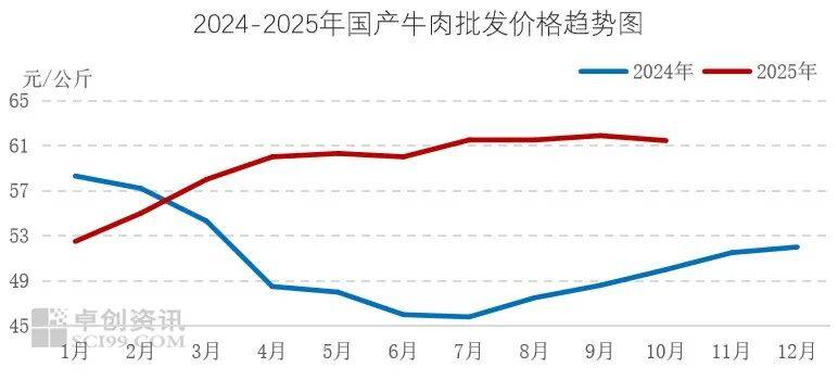 国产牛肉价格微降,进口牛肉价格同步走弱2025年10月,国内牛肉市场价格呈现微降走势。10月,牛肉均价61.44元/公斤,环比下滑0.71%,同比上涨22.88%。