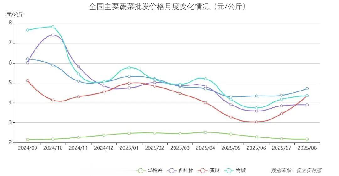10月,全国蔬菜价格先降后升,整体呈现小幅上涨的趋势。农业农村部监测的28种蔬菜全国平均批发价格为每公斤5.07元,环比上涨0.6%,同比下降14.1%。分品种看,环比价格15种上涨,13种下跌。其中,莴笋、冬瓜涨幅超15%。