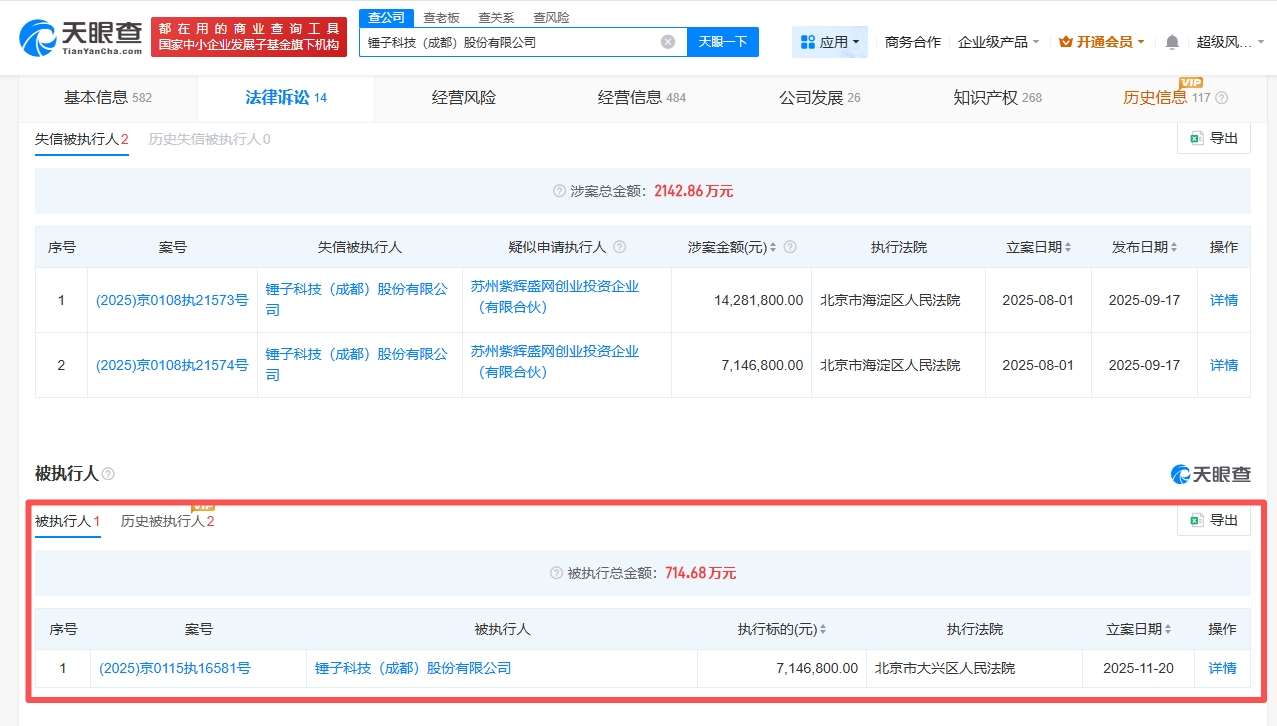 天眼查天眼风险信息显示,近日,锤子科技(成都)股份有限公司新增1条被执行人信息,执行标的714万余元,执行法院为北京市大兴区人民法院。