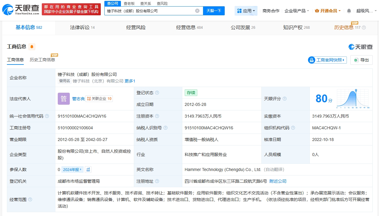 该公司成立于2012年5月,法定代表人为管志良,注册资本约3149.8万人民币,经营范围包括基础软件服务、应用软件服务、组织文化艺术交流活动等。股东信息显示,该公司由罗永浩、成都东方广益投资有限公司、北京明匠汇智投资管理合伙企业(有限合伙)等共同持股。任职信息显示,罗永浩在该公司担任董事长并持股约23%。此前,该公司因未履行2142万元案款,已被列为失信被执行人(老赖)。