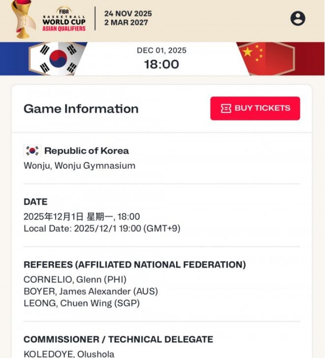 据媒体人赵探长报道,担任本场比赛的三名裁判出炉了。这三名裁判来自菲律宾、澳大利亚和新加坡,其中新加坡裁判梁俊容上赛季季后赛执裁过CBA。此外,中国裁判孙健担任澳新二番战的主裁,两位韩国知名裁判将担任他的副手。