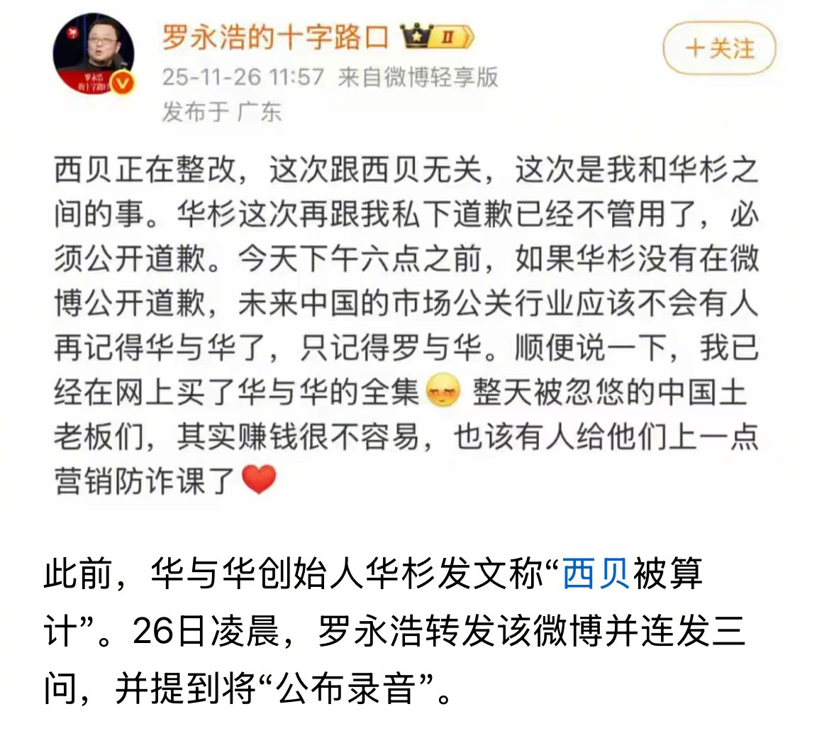 罗永浩转发华与华创始人华杉的微博并连发三问:“谁诱的?谁算计了?你想干什么?你要是说不清楚,我就公布录音了。”随后他又划清界限,明确表示“这次跟西贝无关,这次是我和华杉之间的事”,并给华杉下了最后通牒-于当天下午六点前公开道歉。