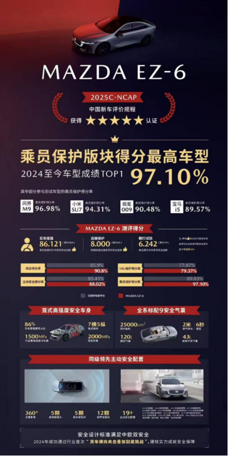在2025年的C-NCAP安全测试中,长安马自达的MAZDA EZ-6不负众望,摘得五星安全评级。此次成绩不仅展现了MAZDA EZ-6在技术和安全性能上的卓越表现,同时也为其全球市场的开拓增添了强大助力。最为引人注目的是其乘员保护得分率高达97%,遥遥领先于众多竞争对手。