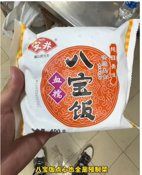 后厨视频显示,豪华大堂背后竟是油污结块的灶台,菜盆随意丢在地上。橱柜里,安井品牌的成品八宝饭标着 “加热即食”,Delmonte 水果罐头堆了半层货架,几箱冷冻熟虾的包装与宴席上的虾一模一样。