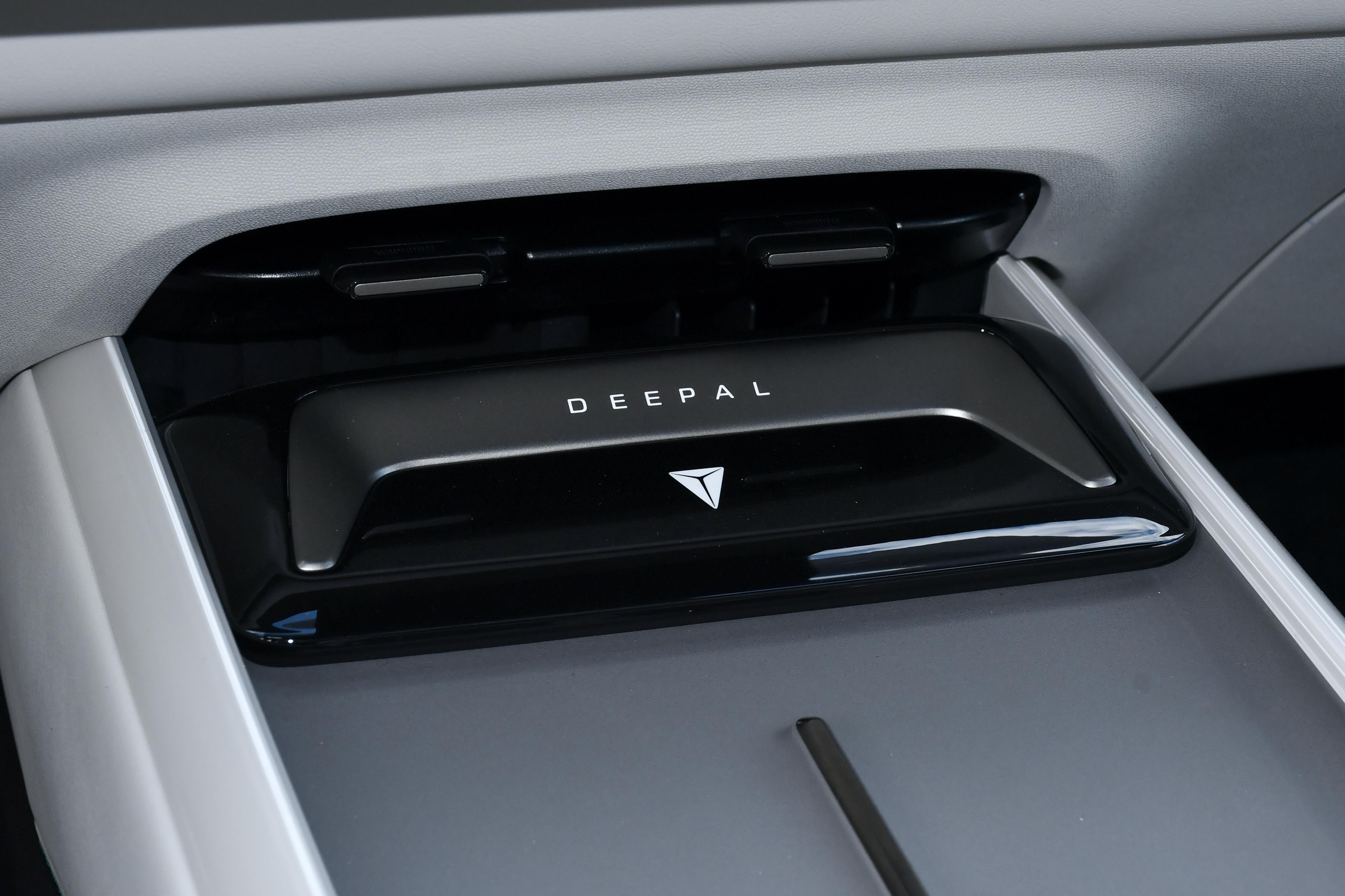 车内座舱看点也很多进入车内后,深蓝L07的车内以时尚简洁为主,其车内整体的布局也很干净利落,贯穿式的空调出风口设计在视觉上也让车内空间显得更为宽敞,同时车内的质感表现也不错,大面积的软质材料手指按压触摸有着一定的回弹,并且看起来不显廉价。值得一提的是,车内的岛台位置还设计了无线手机充电面板、水杯架、下沉式储物格以及中控大容量储物箱,整体的配置和设计也较为实用。