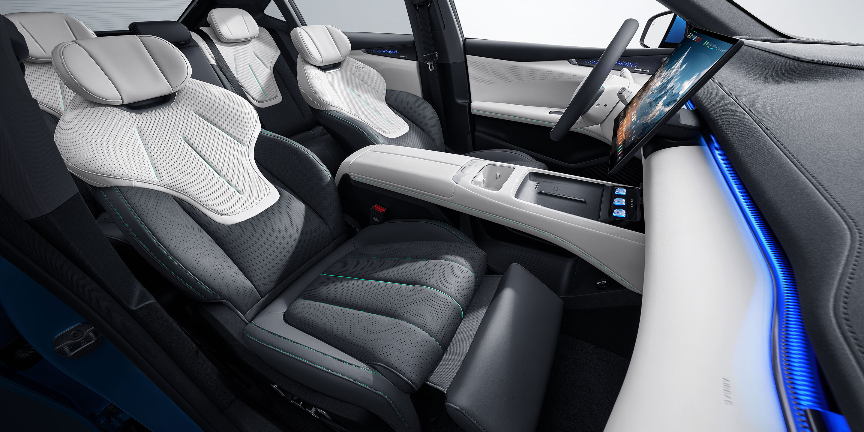 除此之外,车内取消了物理按键以及传统的仪表盘,让车内看起来更为的简洁大方。同时贯穿式的空调出风口设计拉长了车内宽度,从而让车内空间看起来更加宽敞。做工用料方面则是采用了大面积的软质材料,触感上较为的舒适细腻。而在中岛台位置则是设计了无线手机充电面板、水杯架、下沉式储物格以及中控大容量储物箱,日常用车时较为的实用。