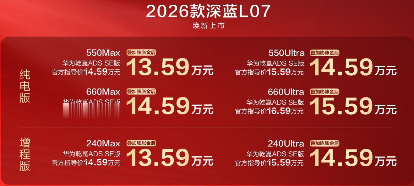 聊车先看价深蓝L07该车定位是一台中型车,其中包括了两款增程动力和四款纯电动力共计六款车型以供选择,同时该款车型目前2026款车型还可有着上市权益,叠加膨胀金后可享受1万元的优惠(活动详情可咨询当地经销商),进而降低入手门槛,在价格上提供了一定竞争力。