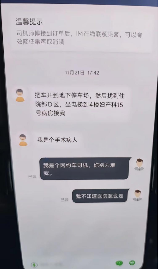 近日,有网约车司机接到一笔去医院的订单,乘客表示上车地址在小区里面,并且强调老人脚别伤下不了地,要求从3楼背下来并抱进车里,到了医院还要把他抱到轮椅上,同时甩下一句“背不了请不要接单”。司机看到直接无语了,停留在对话框那里,不知道如何回复。
