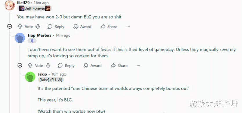 不少海外观众在赛后评论中直言,这可能是“史上最没有说服力的2-0”,在他们看来,BLG作为LPL赛区的一号种子,理应展现出更强的统治力与比赛掌控力,但这场对阵外卡队伍的比赛,却暴露出诸多问题——节奏混乱、沟通不畅、关键时刻判断失误频频,尤其是中后期的团战处理与资源掌控,让人几乎看不出这是一支来自顶级赛区的强队。