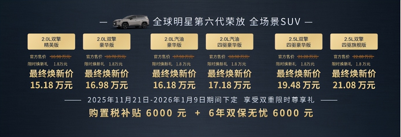 全新荣放实现了全方位升级,在外观、智能座舱、动力、智驾辅助以及安全配置等方面均有显著提升。全系商品力提升幅度达1.5万元,真正做到了增配价更低,诚意满满。为回馈广大用户的支持,自11月21日起至2026年1月9日设定为“限时尊享下定期”。在此期间预订的用户,可享受高达1.8万元的现金直补,以及购置税补贴6000元和价值6000元售后服务权益的双重限时大礼包。