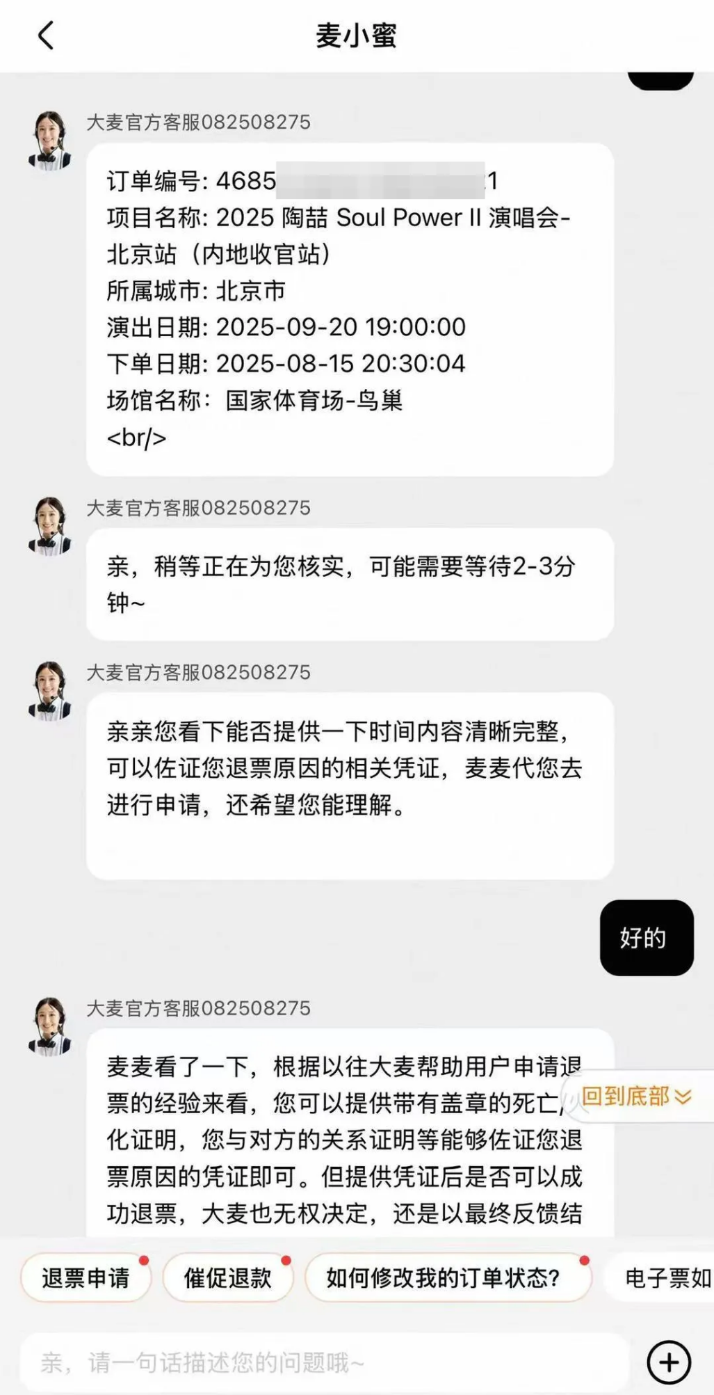 然而到了9月28日上午,大麦网客服又突然致电告知,称该订单不再支持任何退款。