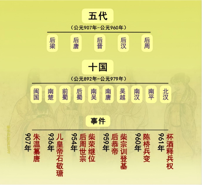 五代特指中原地区先后建立的后梁、后唐、后晋、后汉、后周(口诀:梁唐晋汉周,中原轮着走),均由藩镇演变而来,核心规则是“谁拳头硬谁当皇帝”。