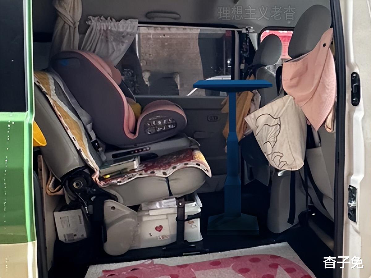 打开右中门,中排是厚实的子母座椅,前面添置了一张蓝色升降桌,是日常喝茶吃饭的地方。