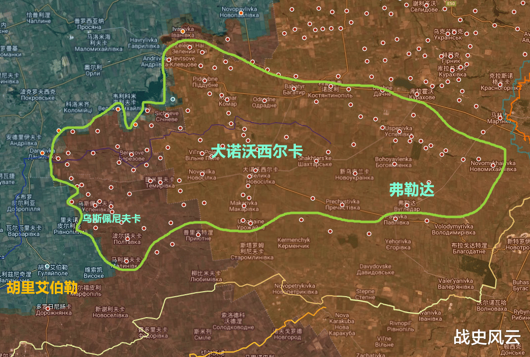 不咋关注俄乌具体战事的网友肯定不知道这五个村镇的意义是啥,简言之这五个村子就是乌军在胡里艾伯勒城(乌军扎波罗热防线的两大要点之一)东北方向扬丘尔河防线的核心部分。