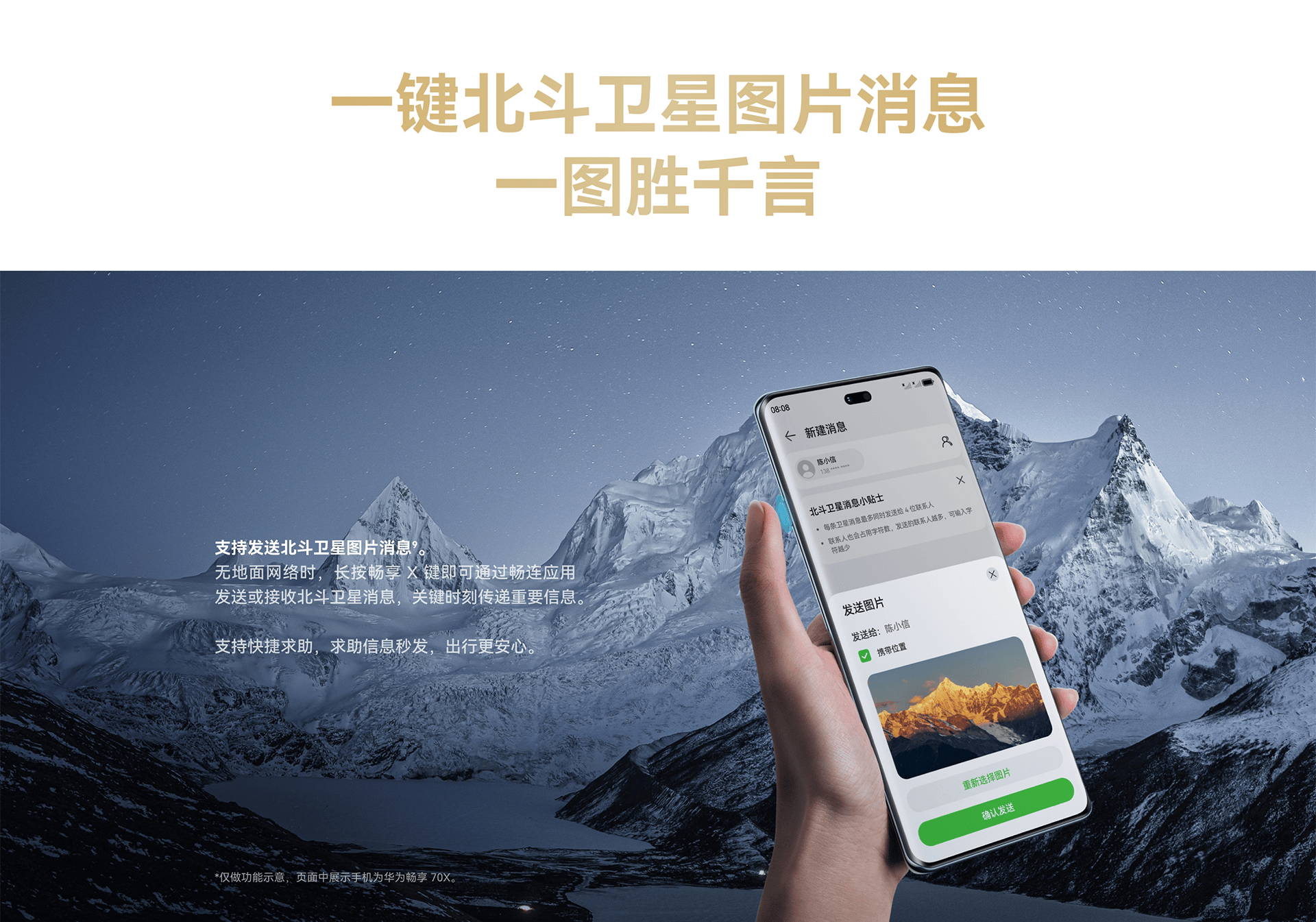畅享70X是华为首次在畅享系列下放北斗卫星消息、北斗卫星图片消息的机型。在以往,这可是Mate系列的专属配置。现在,1799元起售的千元机也能用上。