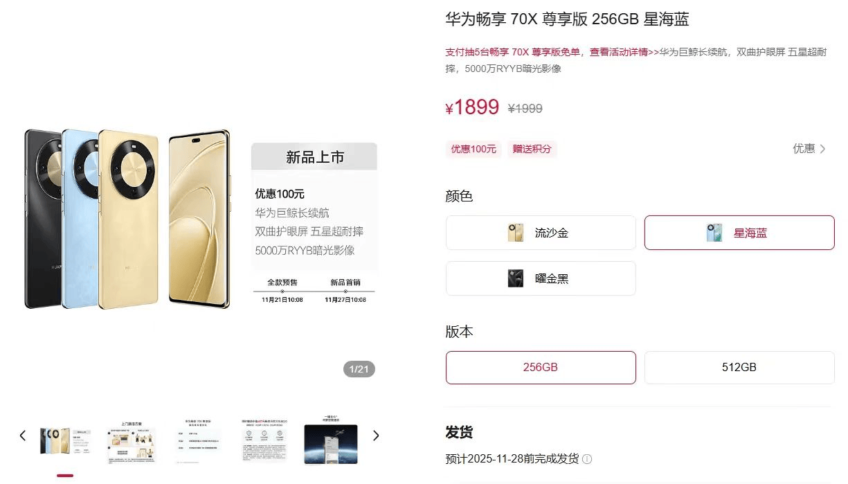 打开华为官网,畅享70X系列现在已经有三个版本:标准版、活力版,还有这次新增的尊享版。尊享版提供8GB+256GB和8GB+512GB两种规格,售价分别为1899元和2199元。