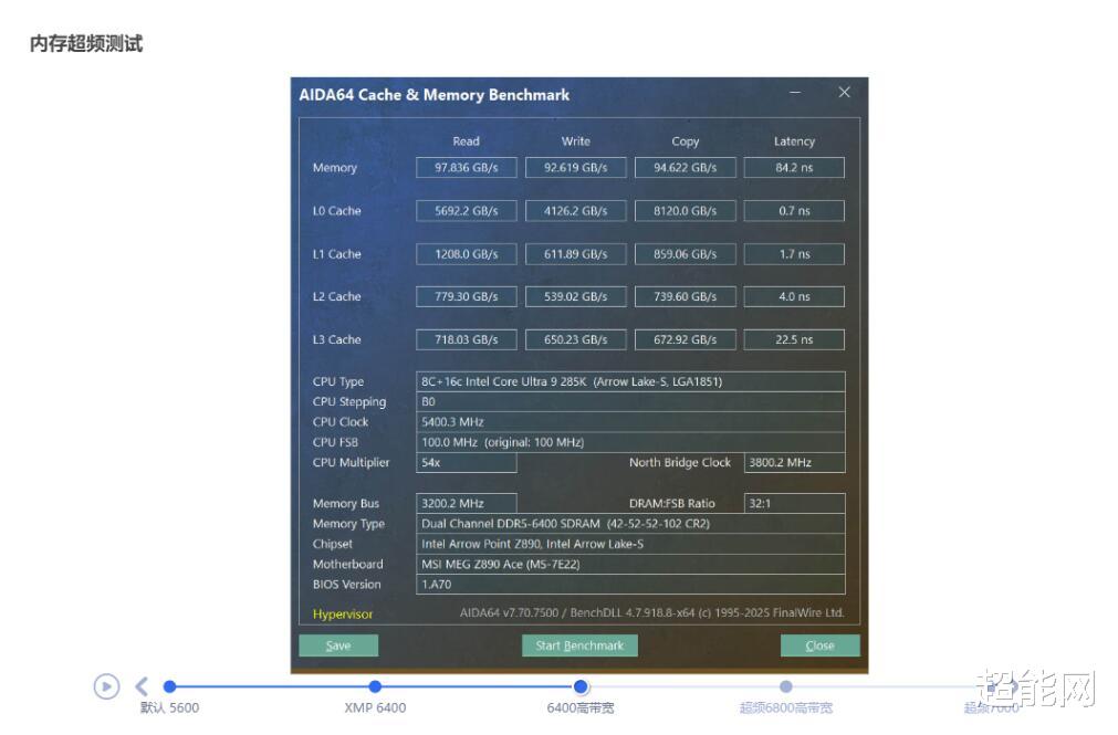 超频测试用的是酷睿Ultra 9 285K处理器,配的是微星 MPG Z890 ACE战神主板,从内存默认的5600MT/s频率开始测试,然后慢慢把频率提上去,并且超频至极限为止,测试内存的带宽与延迟。