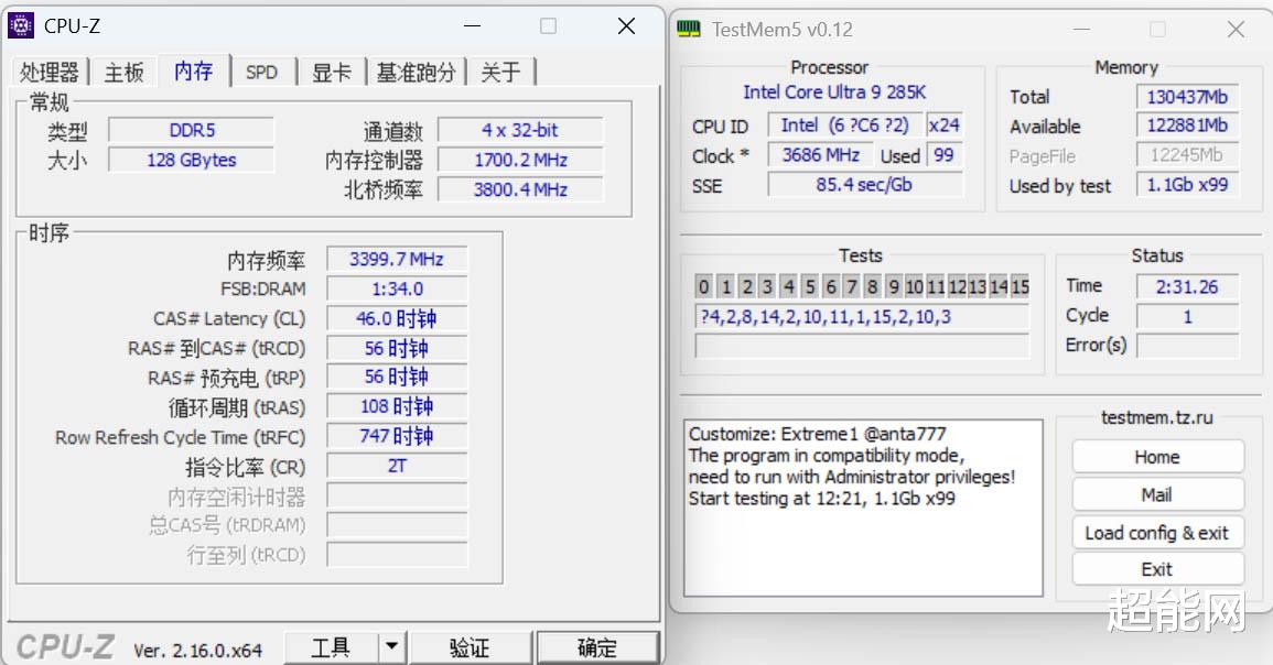 由于这套内存的容量过大,这次我们改用TestMem5来跑稳定性测试,可以看到十铨T-CREATE EXPERT引领者DDR5 128GB内存是能在6800MT/s跑两个小时稳定性测试不报错的,超频后稳定性不错。