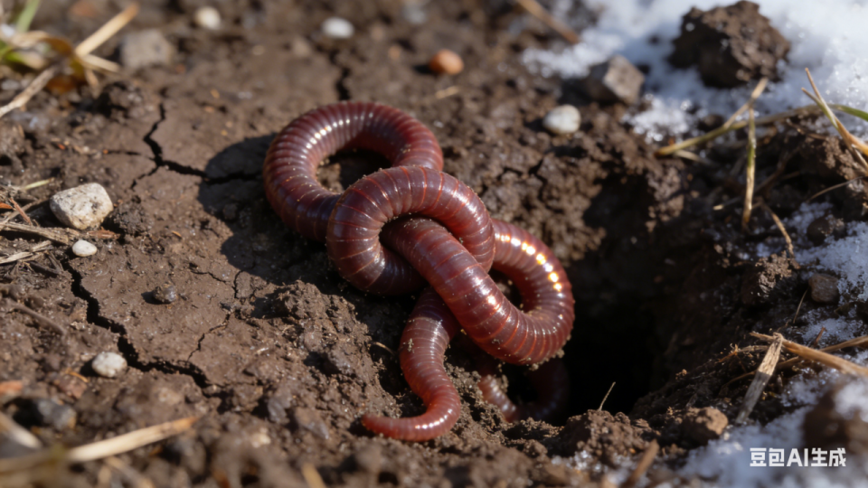 在冬至的第一个五天,蚯蚓因阴气盛极而蜷缩在泥土中,身体弯曲如结。蚯蚓对温度和湿度非常敏感,随着天气变冷,它们会进入休眠期,直到春天暖和时才重新活动。