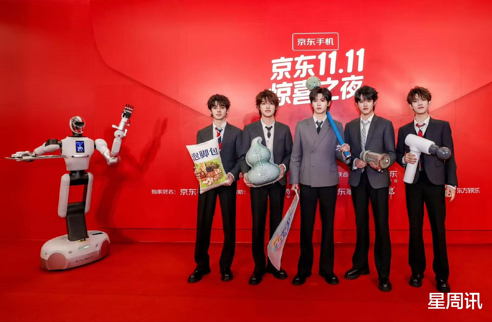 16:30,“惊喜红毯”准时开启,成为整场盛典的“预热狂欢场”。张家驹、小短与京东助理主持海心茹携手把控节奏,JOY、机器人、机器狗、青春采销与艺人组成跨界阵容,分三批次登场,用“惊喜LOOK”、“惊喜好物”、“惊喜POSE”,让红毯充满先锋感。