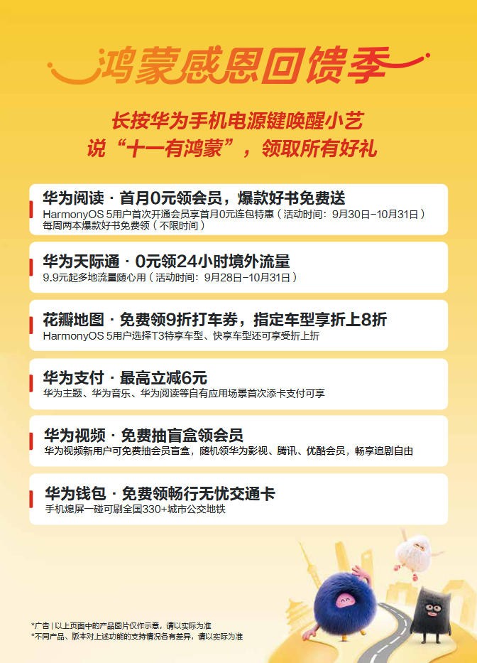 这个国庆中秋双节,即便宅家也不用怕虚度时光。9月30日前升级鸿蒙5.1,右滑进入负一屏“鸿蒙有礼”完成首签,每日签到还能拿到现金红包和抽取随机好礼,包括元服务优惠券、华为阅读、华为音乐、华为视频会员等权益。另外长按华为手机电源键唤醒小艺,说“十一有鸿蒙”,还可享华为阅读首月0元领会员、华为视频免费抽盲盒领会员等各种好礼,每天都有不一样的惊喜!