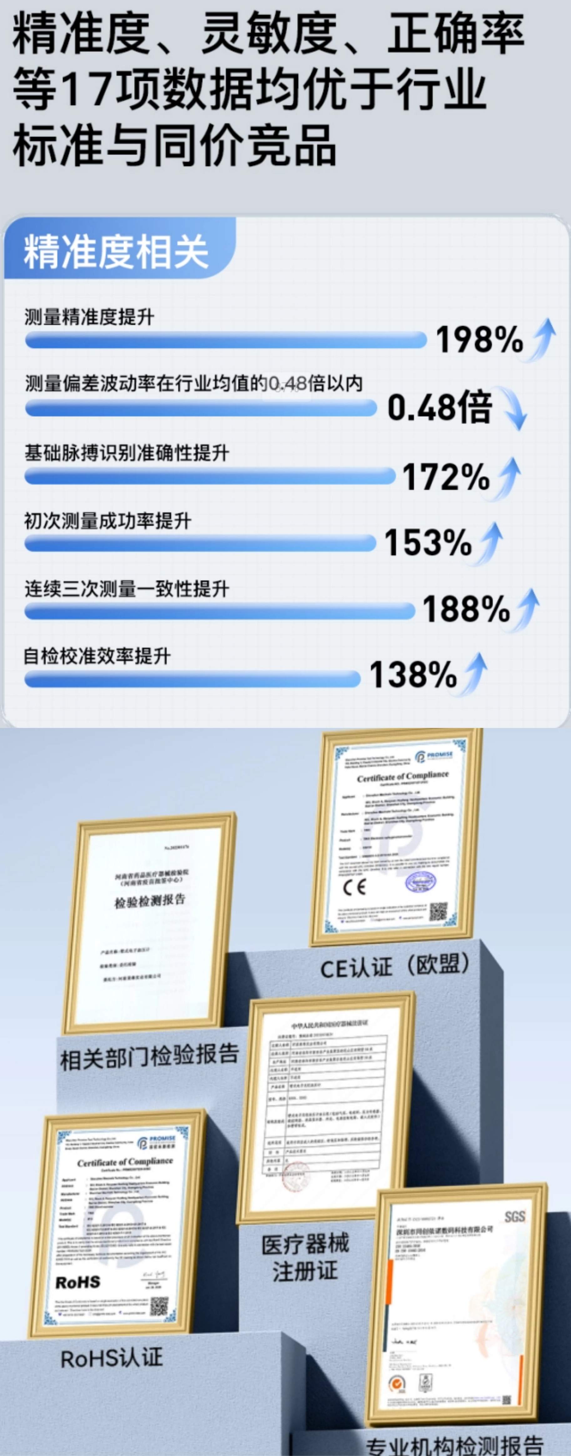 它采用自主研发的无距传感测压技术,将双滤波稳定算法、双通道SOC硬核芯片、自研三重校准算法、双循环检测传感器、增压过程与筒壁无距衔接。这是一种医用级准确测量技术,相较其他血压计测速更快,测量更准确,结果更准确,数据更稳定。对比报告显示灵敏度提升126%,准确度提升198%,稳定率提升102%,是测评过的产品里面最好的,效果足以媲美院线专业测压仪。