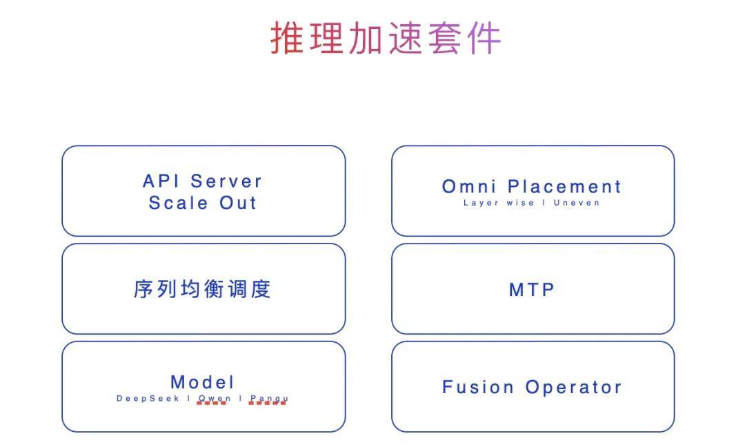 API Server 与 Scale Out 能力让推理服务在昇腾集群中顺畅扩展;序列均衡调度确保不同长度、不同阶段的请求在集群内合理分配,避免出现局部节点拥堵。 模型部署侧支持 DeepSeek、Qwen、openPangu 等不同体系、不同架构的大模型,兼容性良好;Omni Placement 进一步瞄准 MoE 推理最棘手的问题之一 —— 专家放置与负载均衡,通过 Layer-wise 与 Uneven 机制实现不同层、非均匀分布的大规模专家的高效调度。 MTP 与 Fusion Operator,前者提高多 token 并行生成能力,后者通过算子融合减少冗余计算、提升执行效率。可以看到,从服务扩展、任务调度、专家管理到算子加速,这些组件共同构筑起支撑超大规模 MoE 推理的核心加速体系。