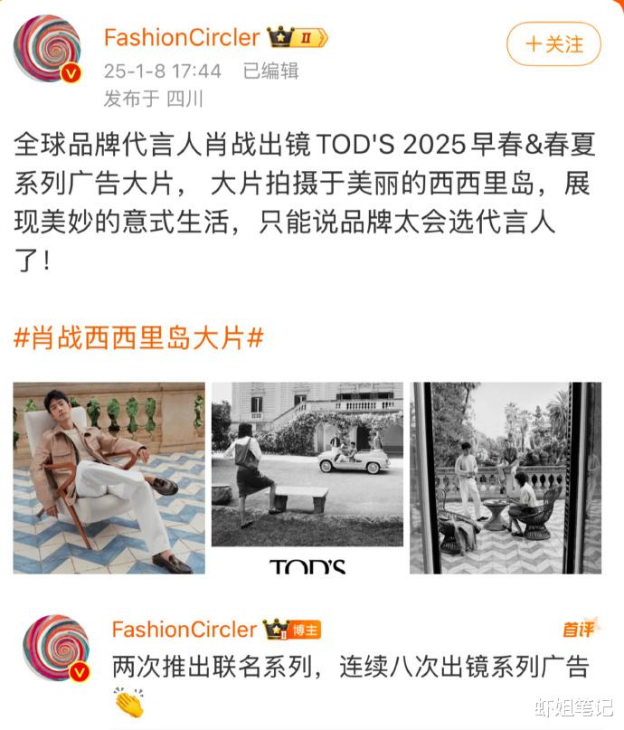 2025年,对于肖战和他的粉丝来说,无疑是一个惊喜连连的年份。从影视作品到音乐创作,再到时尚领域的突破,肖战每一次出场都能带来新的惊喜。而此次与TOD’S的合作,更是他职业生涯中的又一个高光时刻。远赴西西里岛,演绎全球广告大片,肖战用他的实力和魅力,再次证明了他在国际舞台上的不可替代性。