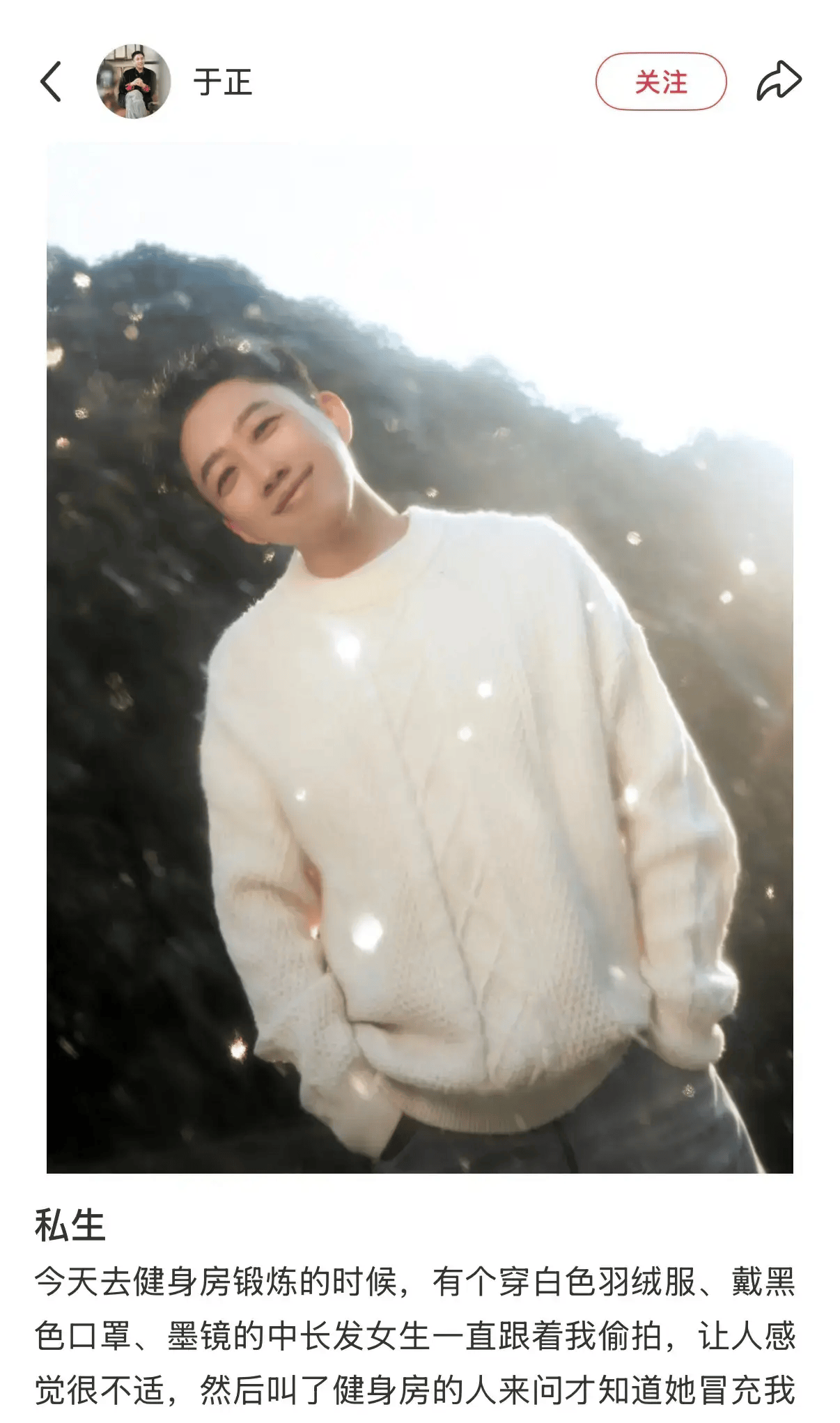 咱就是说这操作也太离谱了!于正说偷拍的是个穿白羽绒服、戴口罩墨镜的女生,一直跟在他身后拍,搞得他练得都不自在。他特意强调,健身房全是大重量器械,自己之前还不小心让哑铃砸到过脚,这么近距离跟着,真怕误伤对方。