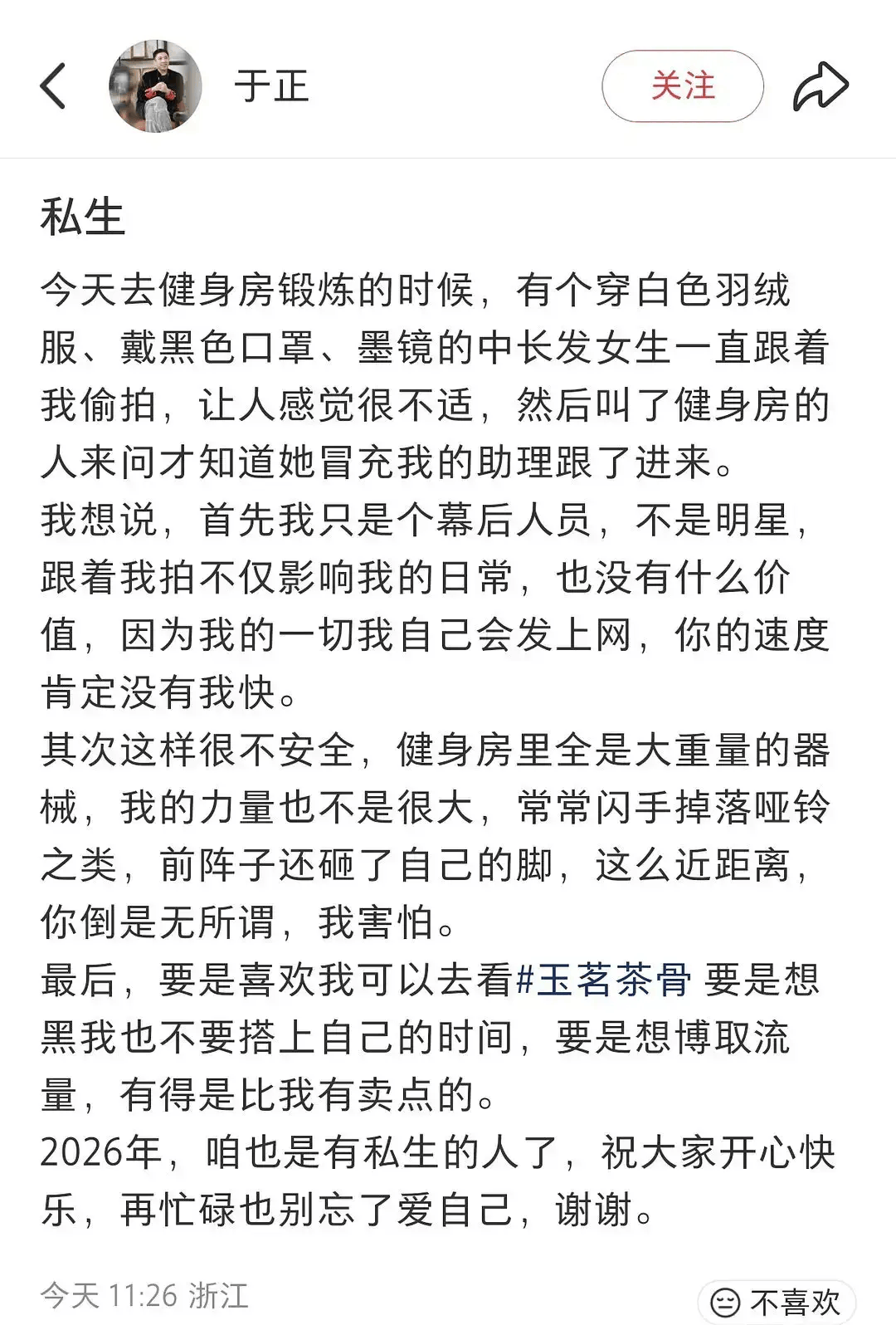 11日于正的一条发文直接笑翻网友!他说自己在健身房锻炼时被人偷拍,问了工作人员才知道,对方居然冒充他的助理混了进来。于正还自嘲“2026年,咱也是有私生的人了”,顺带吐槽这事儿又影响日常又不安全。