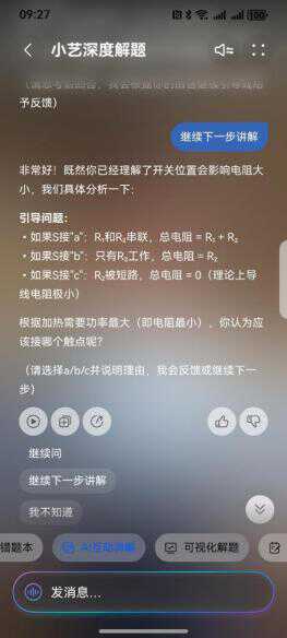 这几天女儿赶暑假作业时,被一道物理电路题难住了。我打开小艺App,在“发现”页的智能体市场找到小艺深度解题Agent,选择“AI互动讲解”模式,拍照上传题目后,它没有直接给出答案,而是用苏格拉底式的启发方式,通过一个个问题引导分析电流走向、计算电阻值。整个过程就像一位耐心的老师在旁边帮忙理清思路。
