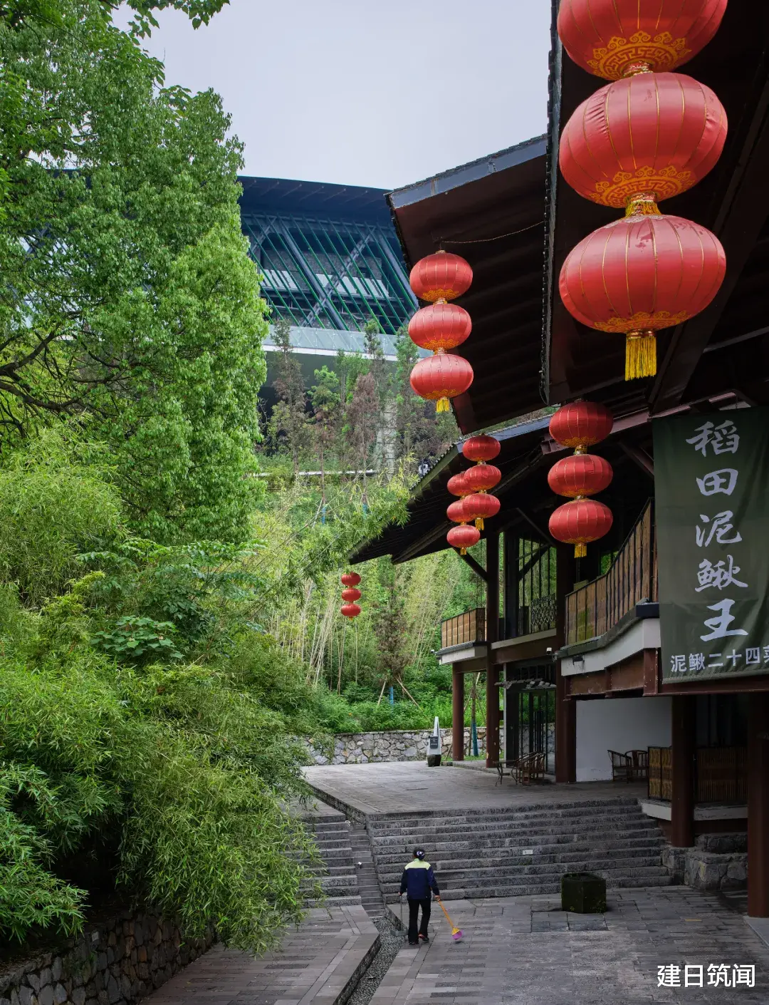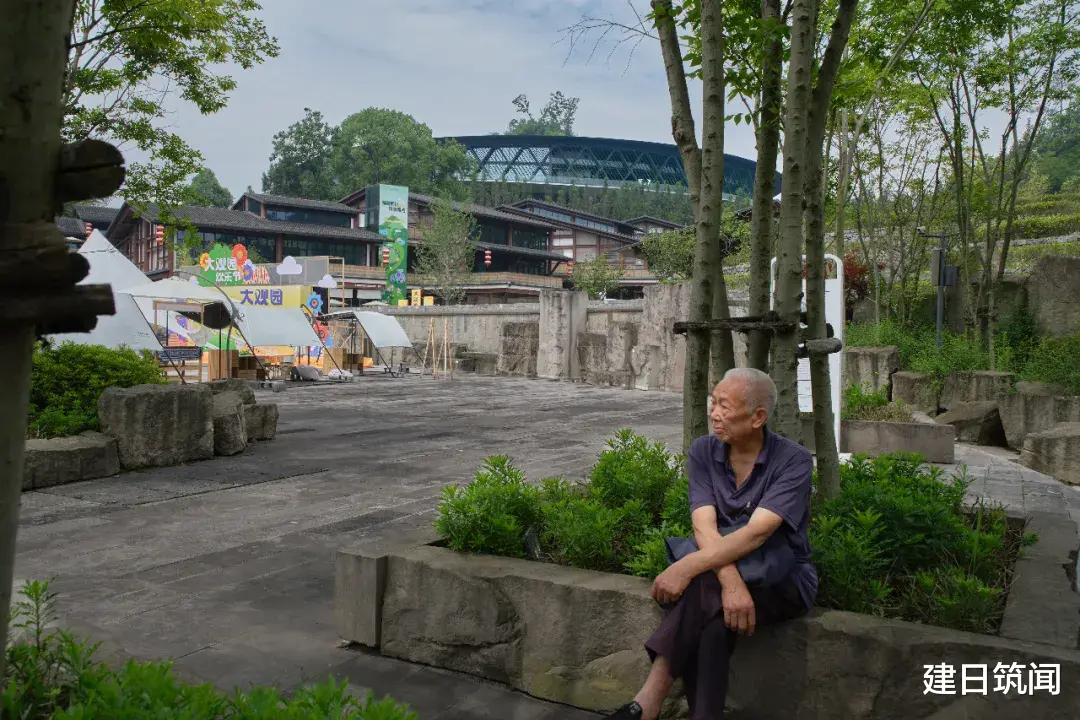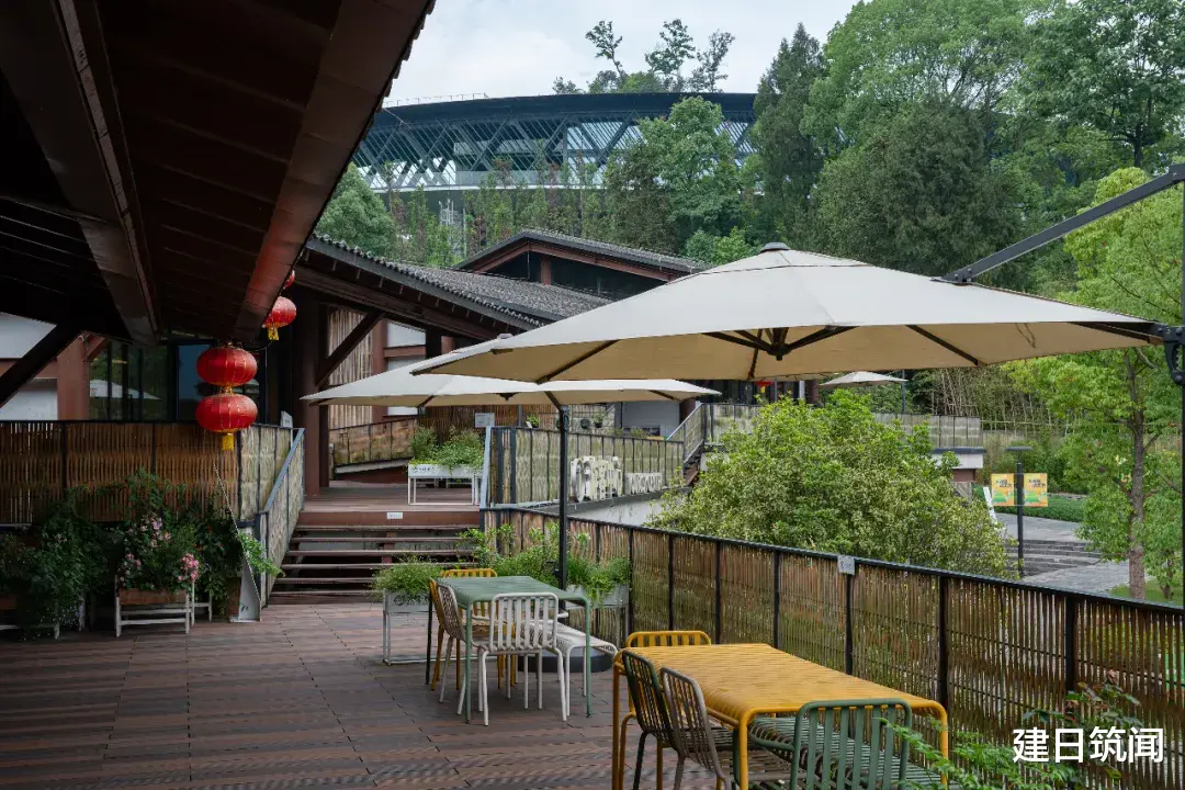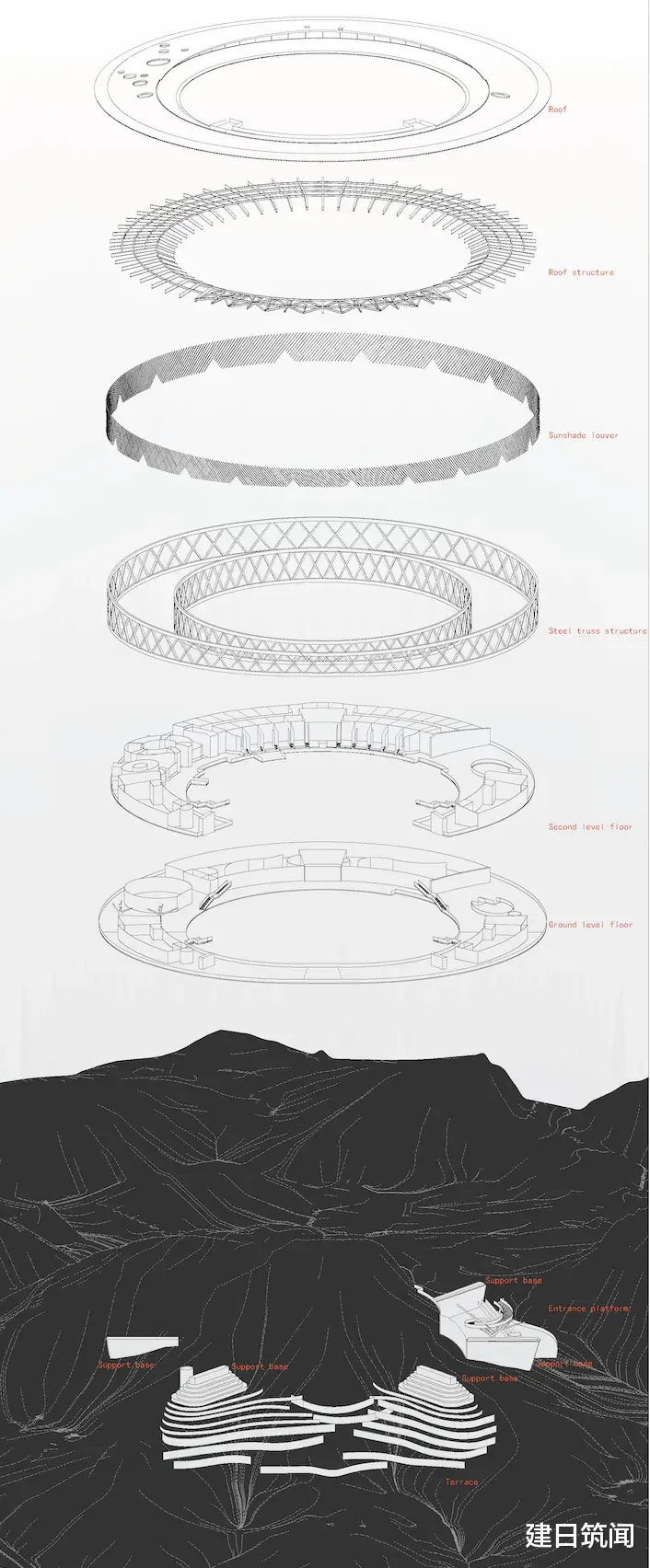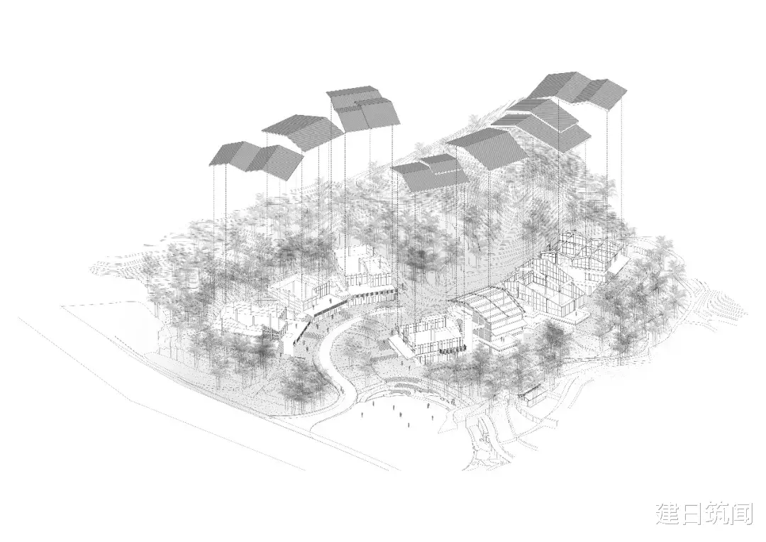 设计将复杂地形转化为自然特色。两组建筑分别以不同的方式回应自然。山脚下的市集拆分为小单元,顺应高差逐台布局,利用架空、吊层等办法契合自然地貌。山顶的环形部分,将自然山体环抱,强化自然的核心。
