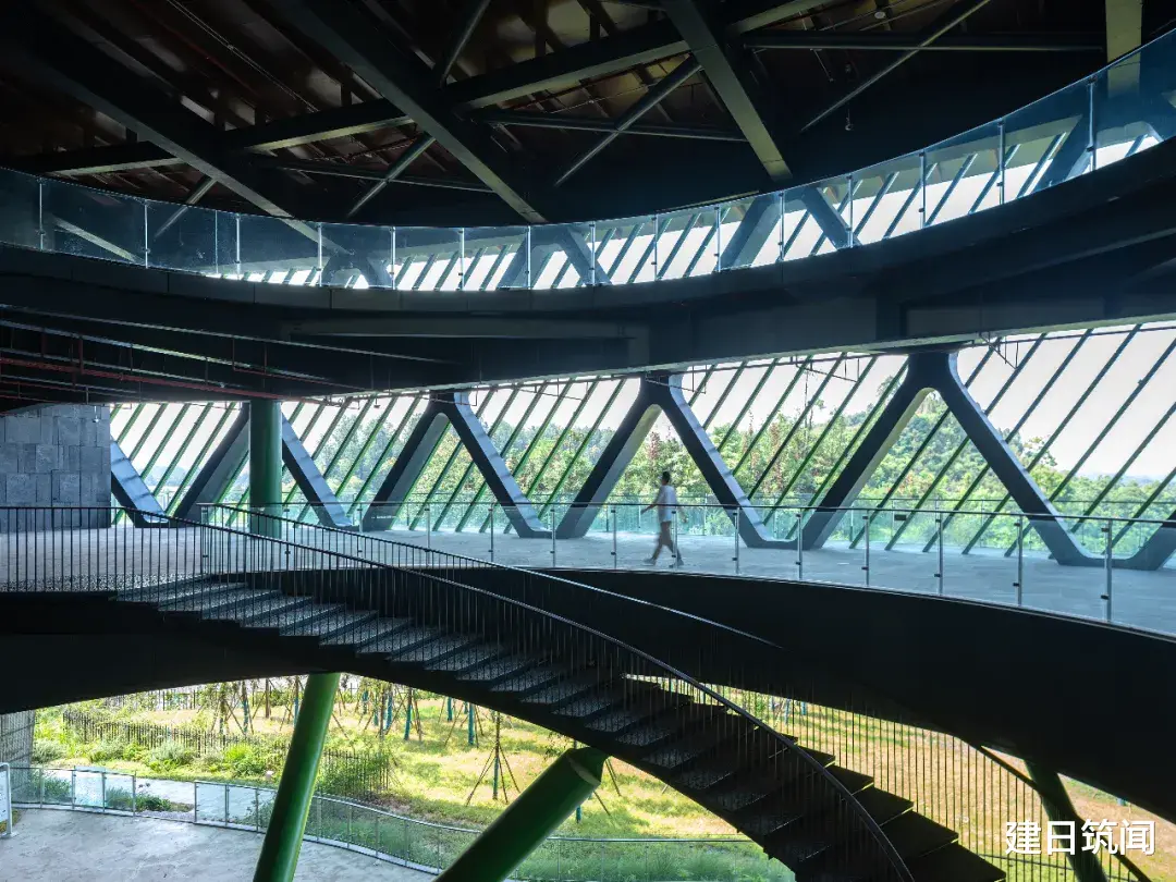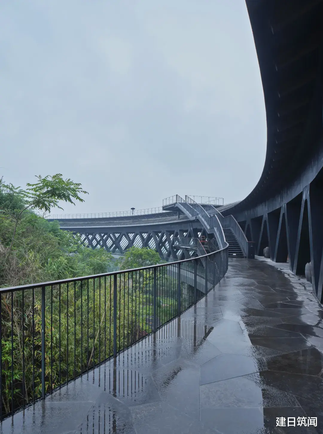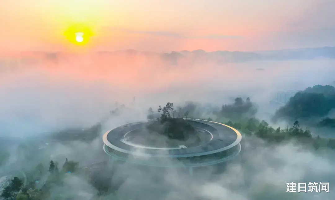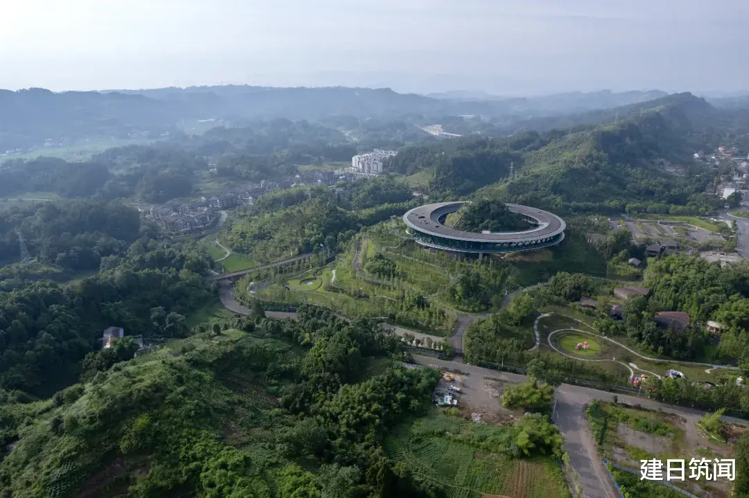 基于保留原始地形和自然植被的出发点,场地成为一个乡野公园,建筑与自然相互咬合,成为景观的一部分,尤其是上部的环形部分,环绕山丘形成约 85 米跨度的漂浮桥廊,成为环绕自然的胜景。屋顶的彩虹光伏玻璃栈道,向外可尽揽乡间自然胜景,向内可观内山清幽,并与内山中保留的山神庙延续时空对话,成为自然的精神图腾。