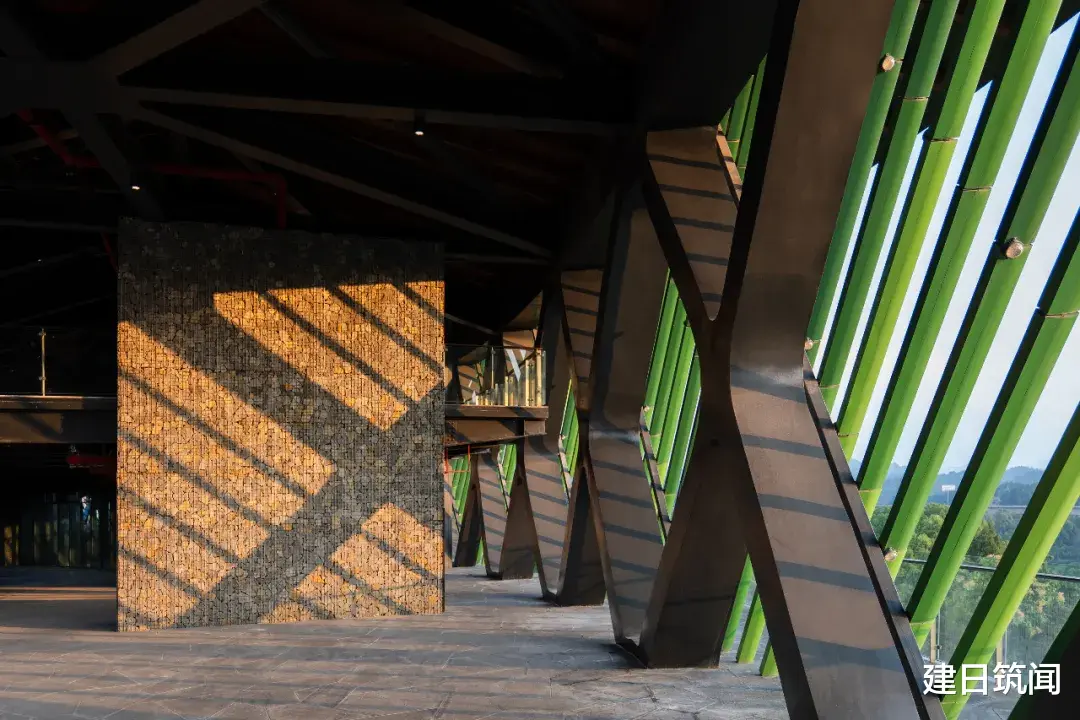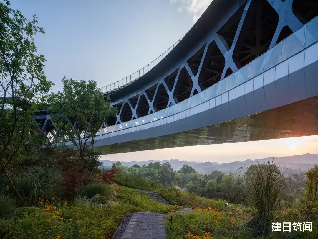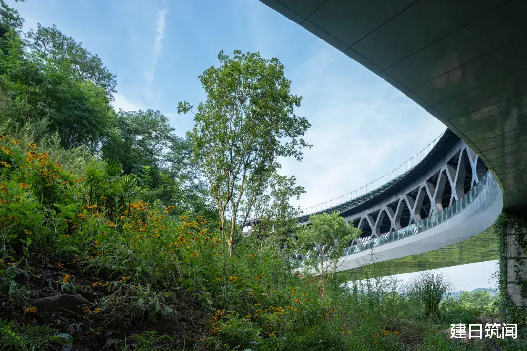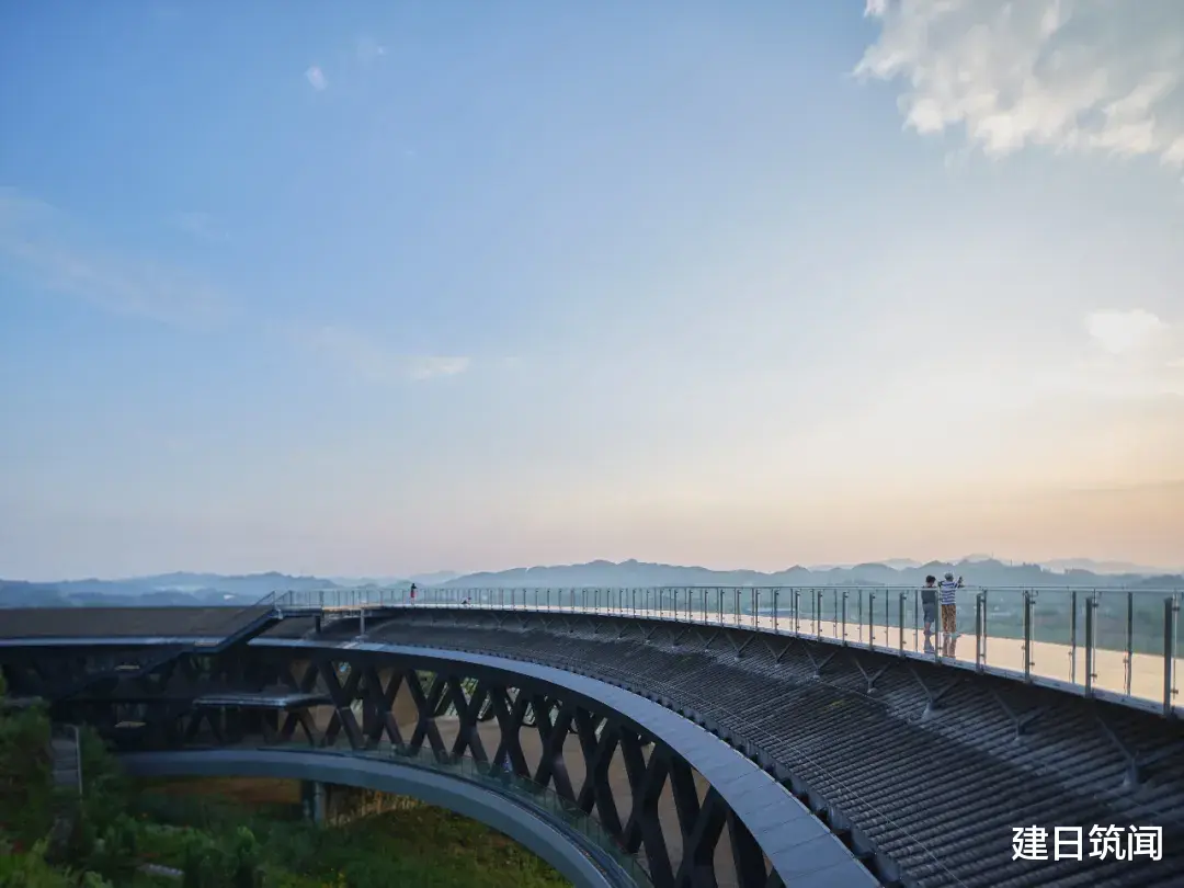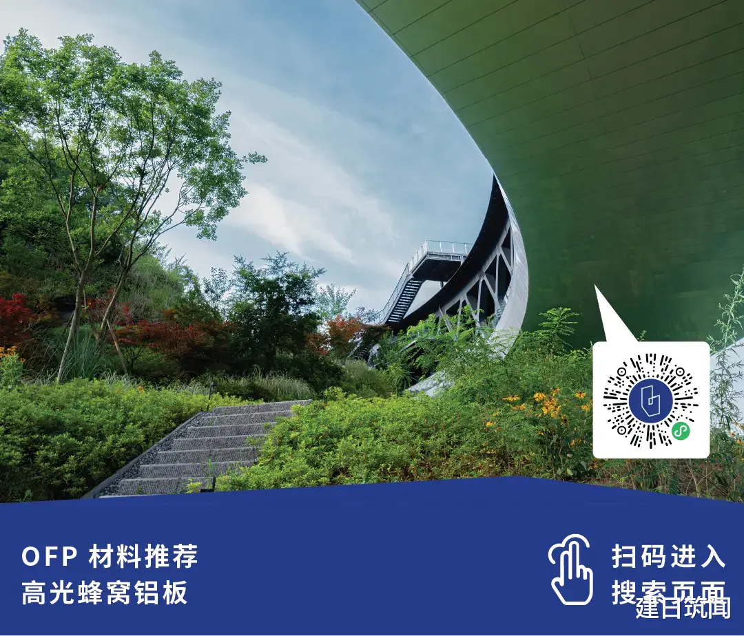 基于保留原始地形和自然植被的出发点,场地成为一个乡野公园,建筑与自然相互咬合,成为景观的一部分,尤其是上部的环形部分,环绕山丘形成约 85 米跨度的漂浮桥廊,成为环绕自然的胜景。屋顶的彩虹光伏玻璃栈道,向外可尽揽乡间自然胜景,向内可观内山清幽,并与内山中保留的山神庙延续时空对话,成为自然的精神图腾。