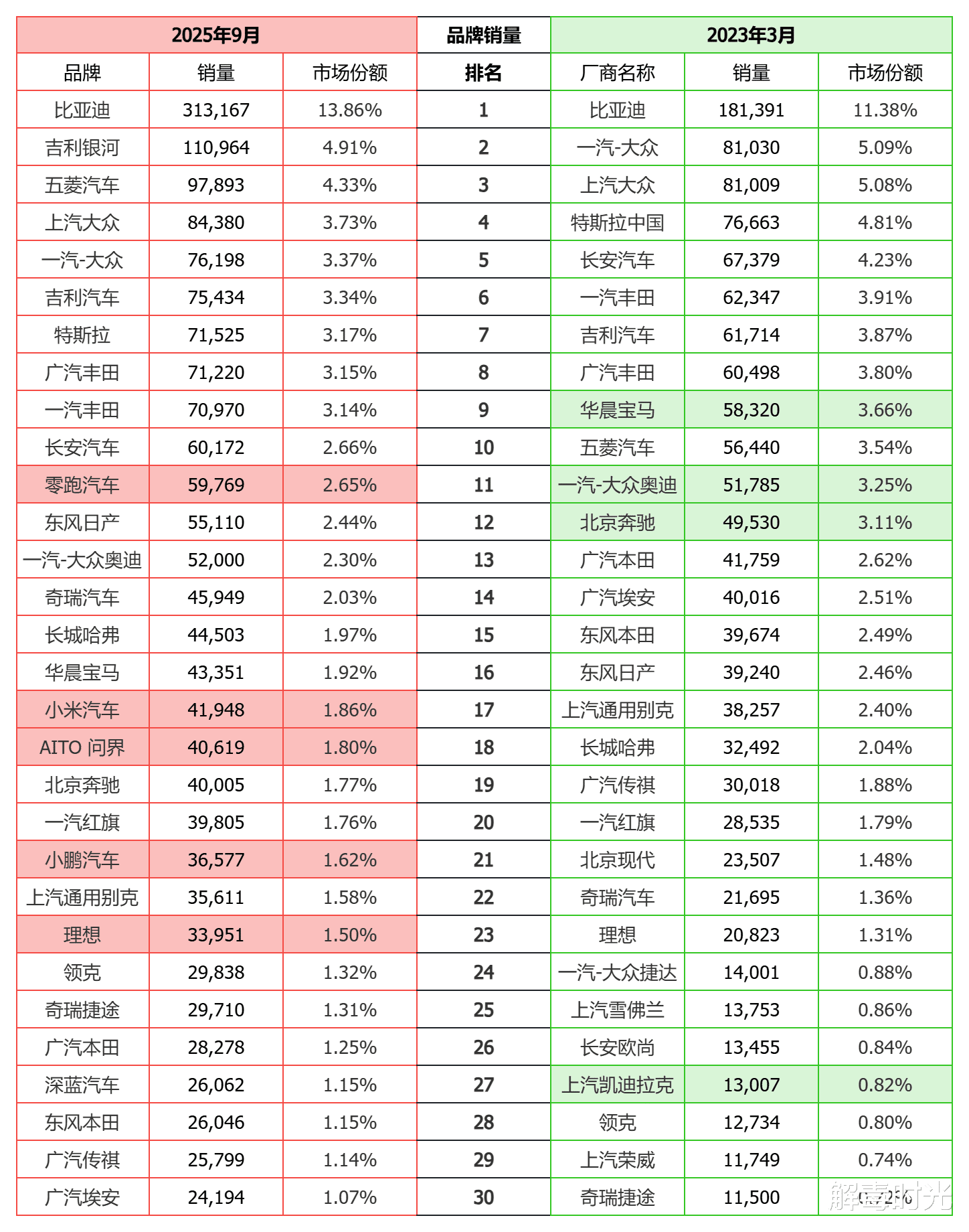 通过对比2023年3月和2025年9月品牌销量排名的前三十可以发现,2023年的四家豪华品牌只剩下三家上榜,并且无一进入前十名。另一方面,零跑已经摸到了前十名的门槛,而只有两款车的小米竟然也挤进了前二十名。最令人堪忧的,要数广汽,广汽本田、广汽传祺和广汽埃安已经跌倒了三十名的底部,只剩下广汽丰田在苦苦支撑。