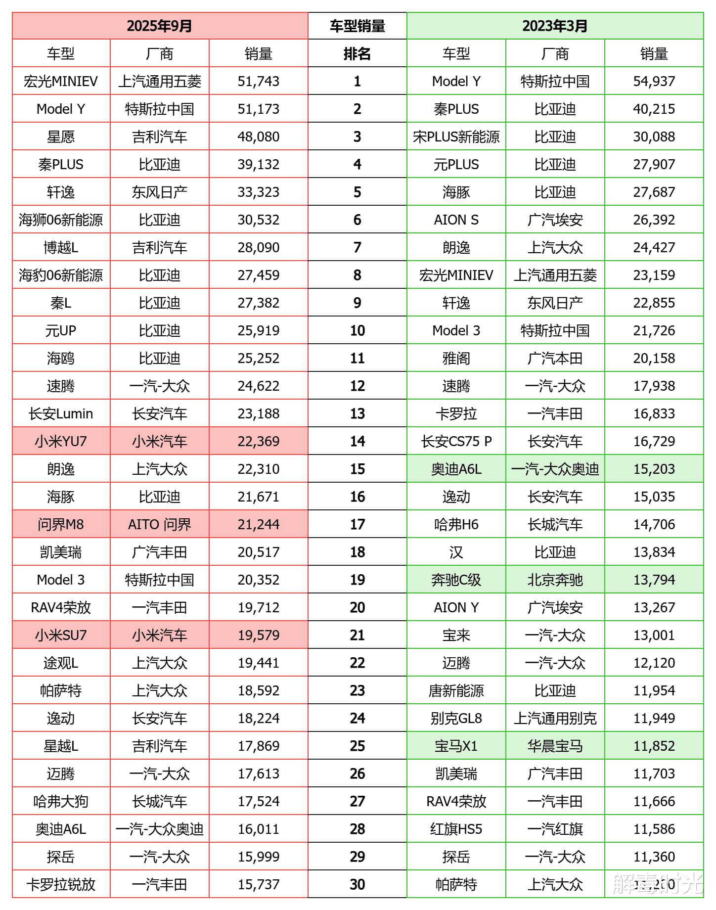 这些冷冰冰的数字背后,讲述的是一个新品类逐渐从弱小成为主力的过程,也就是新能源和传统能源在市场当中此消彼长的过程。拉出2023年3月和2025年9月单车月销量排名前三十数据,2023年3月有11款新能源产品,但全部来自于四家车企——特斯拉、比亚迪、广汽埃安和上汽通用五菱。而2025年9月,有15款上榜新能源产品,同时它们分别来自八个企业。新能源的占比提升,同时集中度分散,证明市场已经打开。