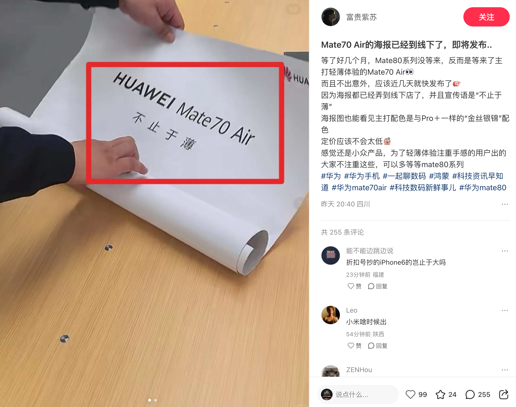 此前,有消息显示,继三星、苹果之后,华为也将推出Air款机型——华为Mate 70 Air。近日,网络上出现了更多关于该产品的信息。