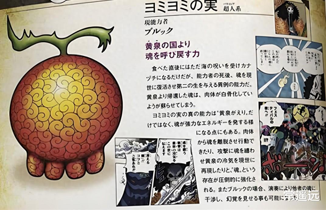 布鲁克最早登场时,黄泉果实的能力仅仅体现在可以让能力者重生一次,布鲁克之所以是骷髅形象,是因为恐怖三桅杆地区大雾弥漫,布鲁克的灵魂花费了太长的时间才找到自己的身体,当获得重生时,身体已经腐朽成一堆白骨。也许是尾田认为复活币般的黄泉果实过于弱鸡了,所以在草帽图两年的修炼之后,布鲁克渐渐学会了黄泉果实的更多能力,例如灵魂出窍、对敌人的灵魂进行攻击等等,总而言之十分的牵强。