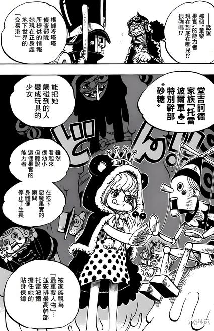 童趣果实的设定十分简单,只要被能力者触碰到,任你武力值再高,也会被变成一个玩具,而且心甘情愿的服从砂糖的操控,同样是制造军团,砂糖的效率可比身为七武海的莫利亚效率要高的多,不过童趣果实也并非完全无解,咱们的大神乌索普,就歪打正着吓晕了砂糖,解救了所有玩具人,被他们奉为神明,悬赏金一跃飙升至2亿贝利。