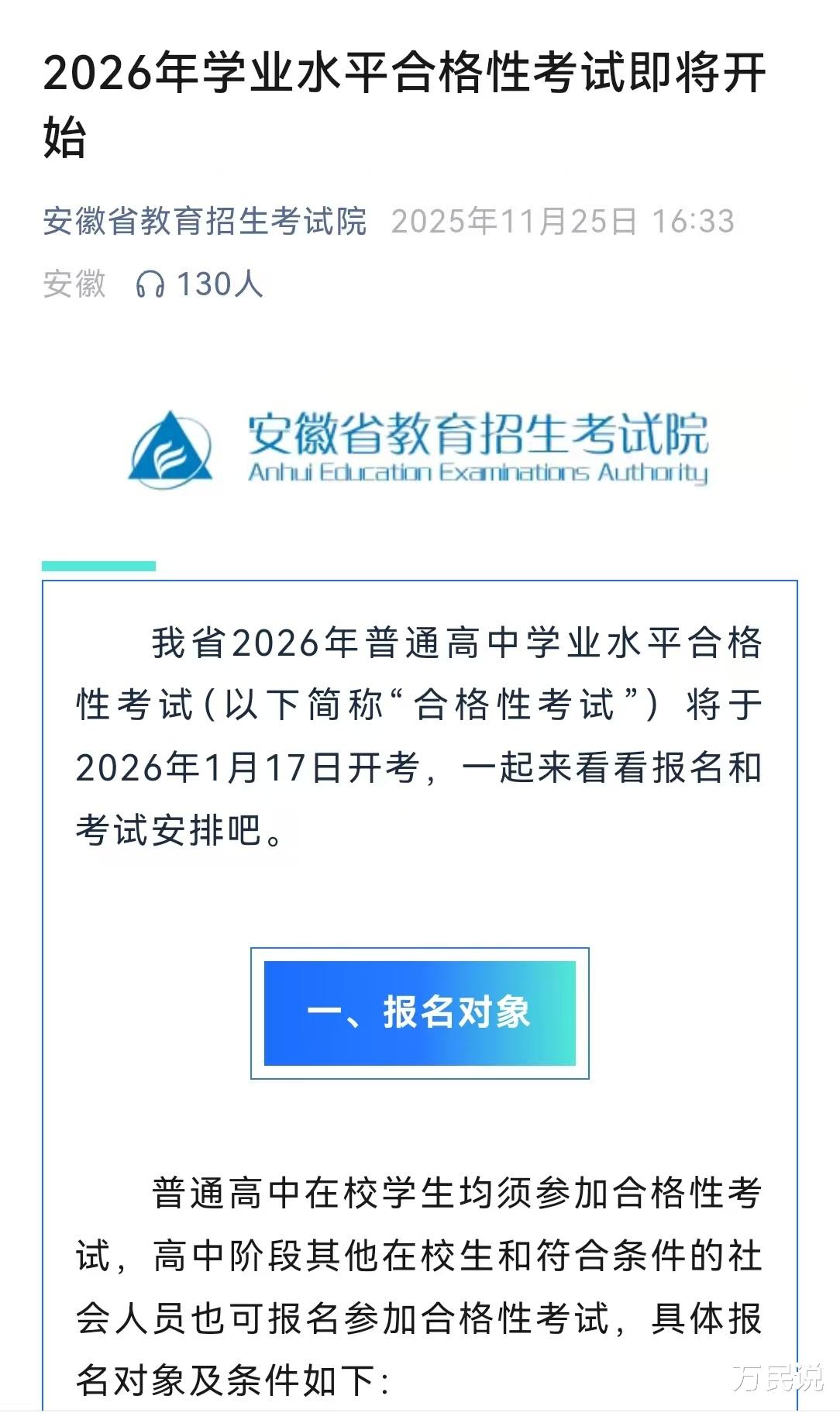 11月25日,安徽省教育招生考试院的一则官方消息,在高二学生和家长圈中投下了一颗“石子”——2026年普通高中学业水平合格性考试定于2026年1月17日举行。掐指一算,备考时间仅剩五周!
