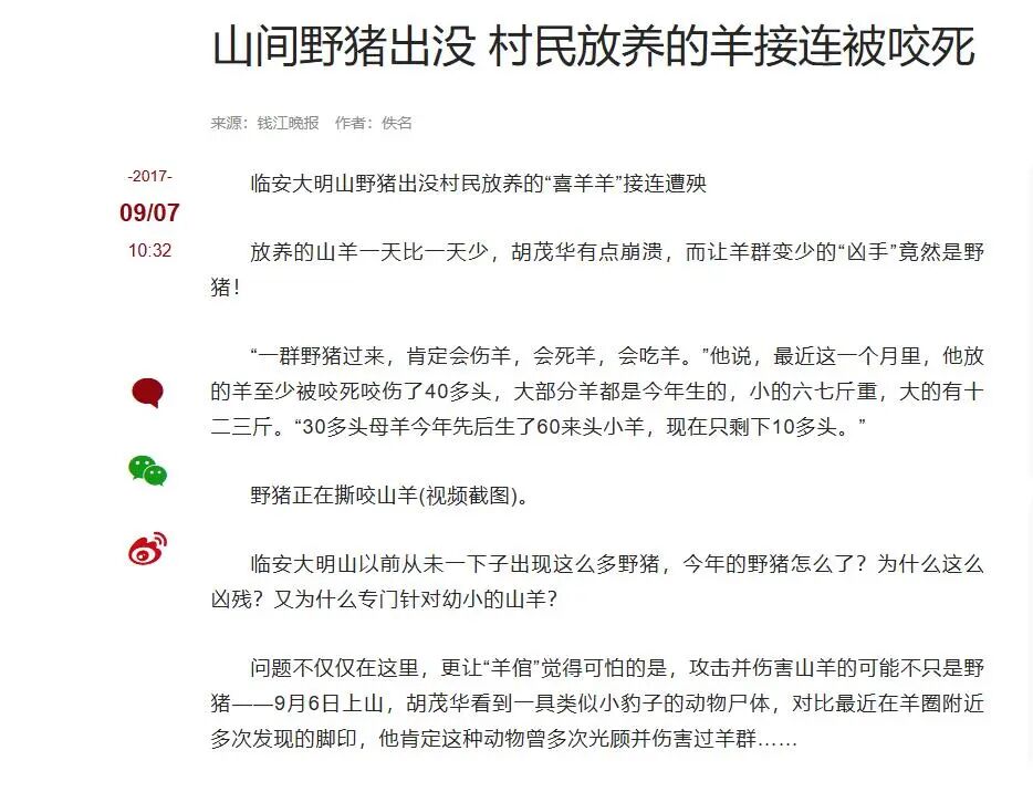 记者注意到,2017年曾有公开报道显示,浙江临安大明山有野猪出没,一个月时间里,有村民家放的羊至少被咬死咬伤了40多头,大部分都是当年生的羊,小的六七斤重,大的有十二三斤。