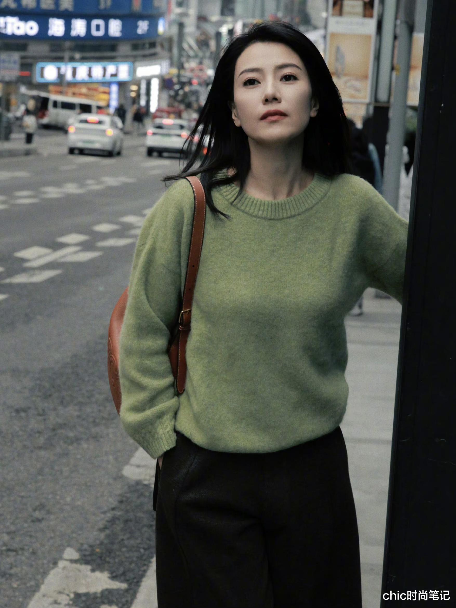 同样是v领的白色衬衫,搭配上豆绿色风衣又是另一种风格,随性而洒脱的休闲感不是谁都能随随便便穿出来的,自身的气场和阅历来展现轻熟气质。