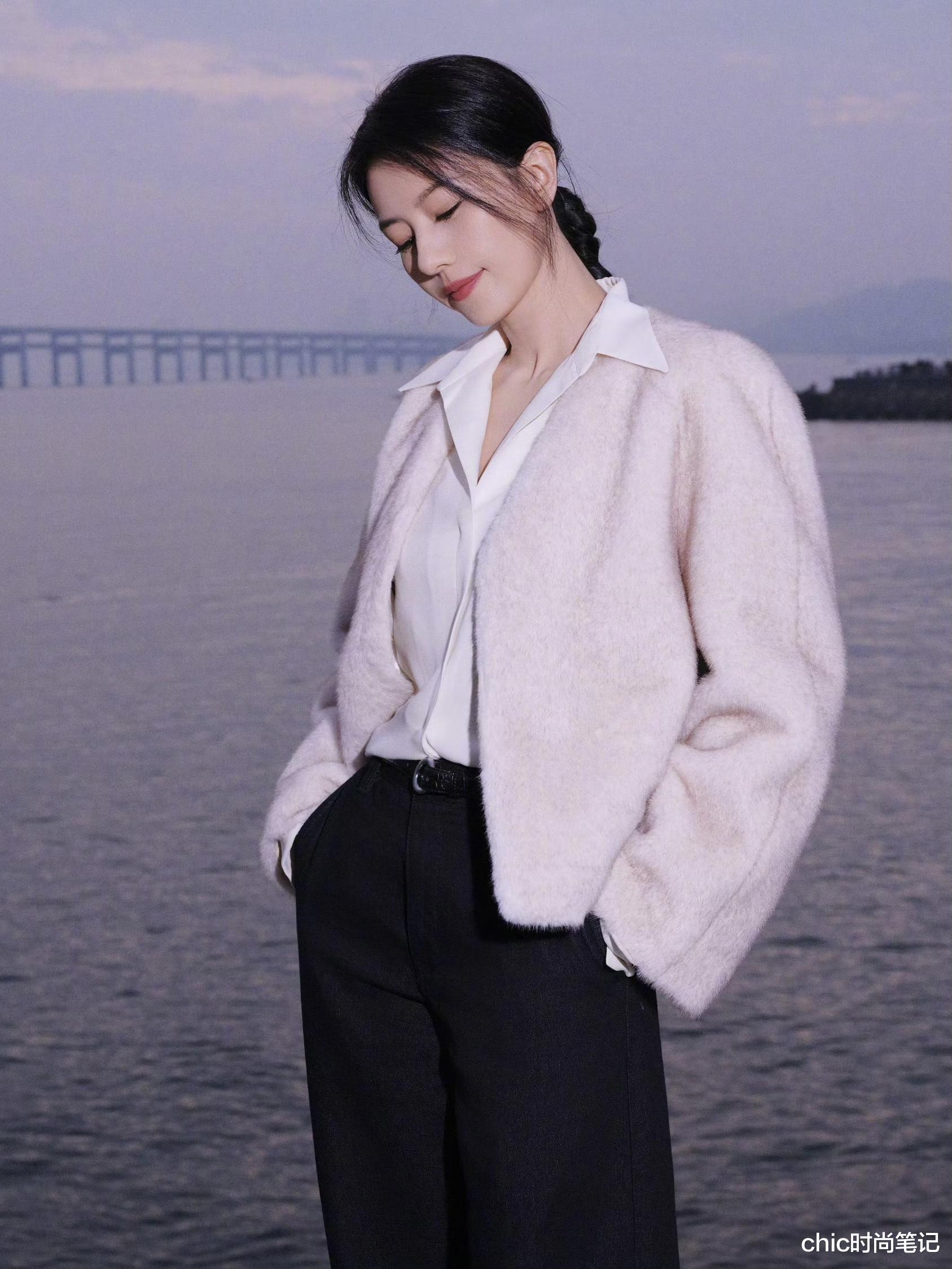 高圆圆的松弛感与生俱来,与优雅、高级等名词挂钩,白色v另衬衫外搭一件短款的羊绒外套,下身是一条黑色的西裤,又纯又A的穿搭轻松展现。