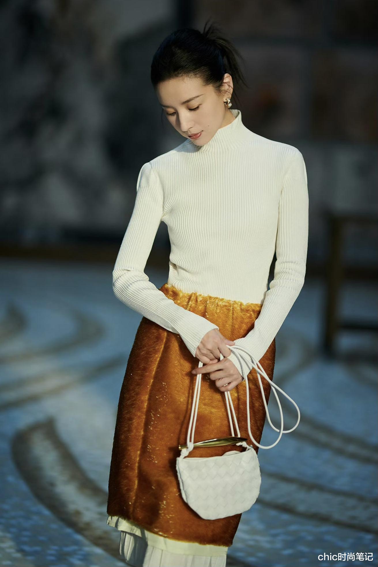 修身半高领毛衣搭配半身长裙,轻熟风就是要摒弃那些特别宽松臃肿的单品,用修身版型的服装去打造时尚高级感。