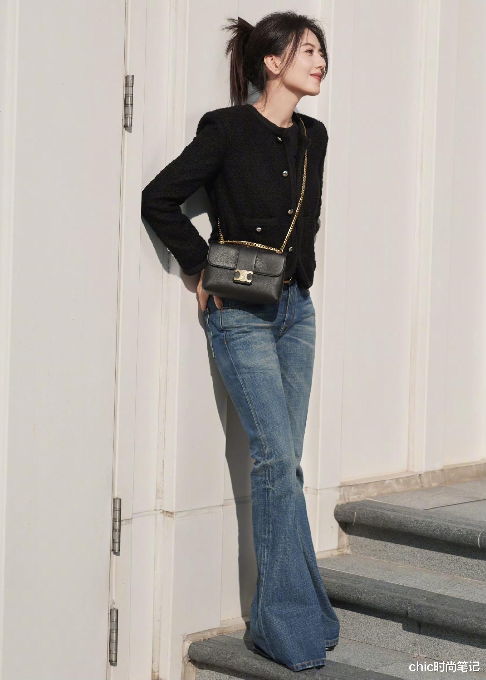 优雅的小香风黑色外搭搭配牛仔喇叭裤,短款上衣和修身长裤的搭配完美的展现了身材比例,轻熟女的曲线美轻松get。