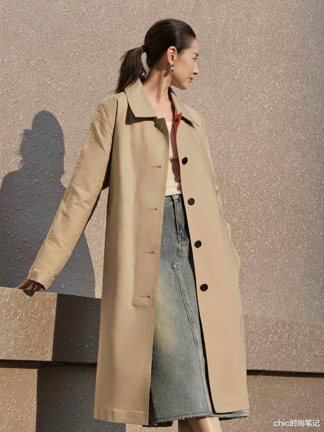 风衣作为优雅的代名词再穿搭中必不可少,卡其色中长款风衣搭配牛仔半身裙,硬朗线条帅气又休闲。