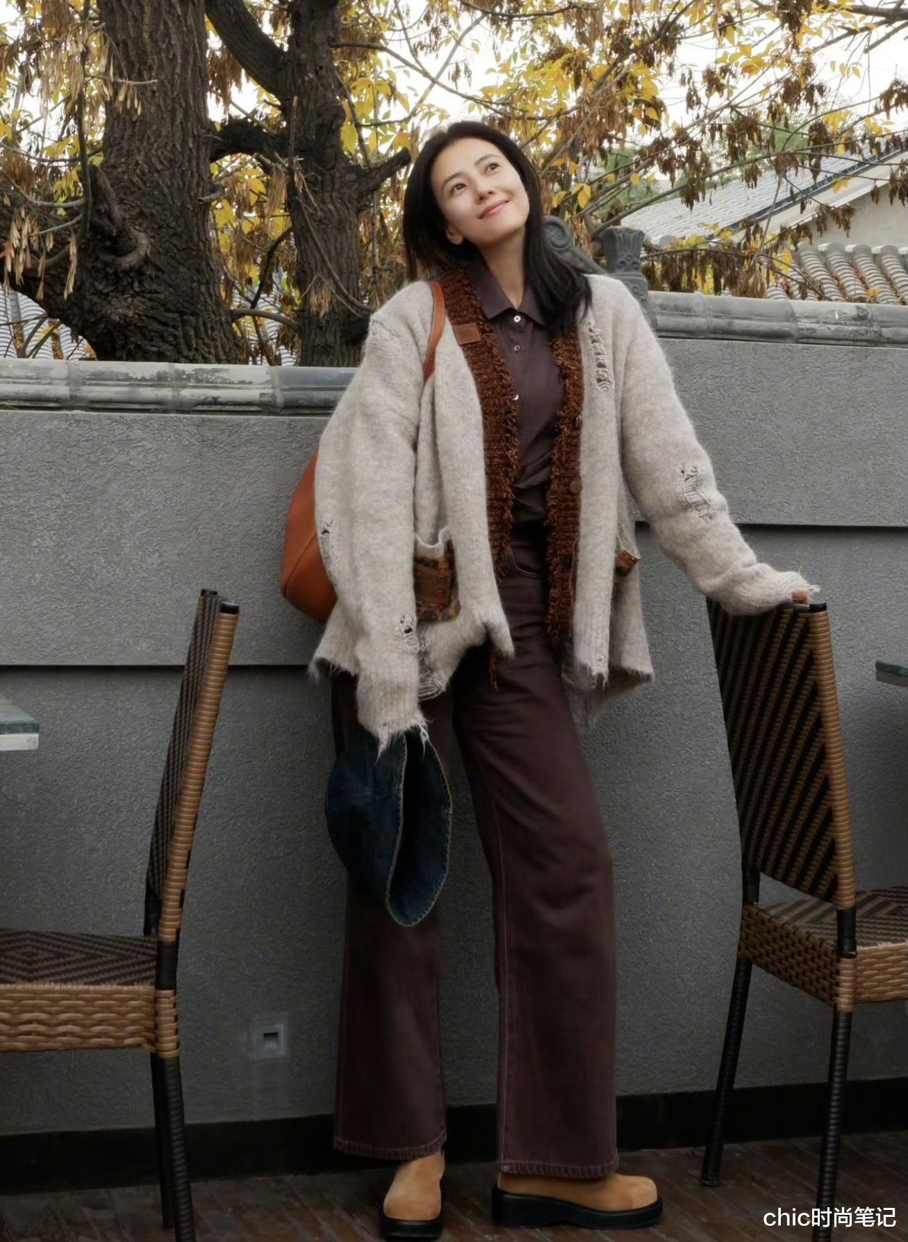棕色衬衫搭配棕色休闲长裤,燕麦色不规则破洞毛衣外套的加持让整套穿搭变得更加细节有层次。